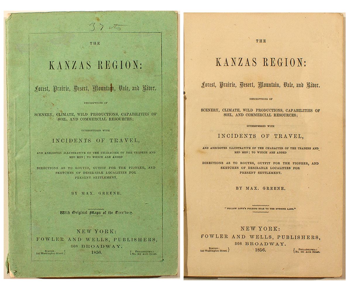 Rare pale green soft cover version. Descriptions of Scenery, Climate, Wild Productions, Capabilities of Soil, and Commercial Resources; interspersed with Incidents of Travel, and Anecdotes Illustrative of the Character of the Traders and Red Men; to which are added Directions as to Routes, Outfit for the Pioneer, and Sketches of Desirable Localities for Present Settlement. Written by Max. Greene. With original Maps of the Territory. Published by Fowler and Wells, Publishers, New York, 1856. "This well written book contains a good account of the prairie and mountain region with many incidents in the author's own experiences from 1850 to 1855, as well as a history of the Santa Fe trade and descriptions of the Santa Fe Trail." The author, it has been suggested, was a tramp printer sent west by a Pennsylvania newspaper. The map illustrates the Kansas area. (7 3/8" x 4.75") 192 pp. Good condition.