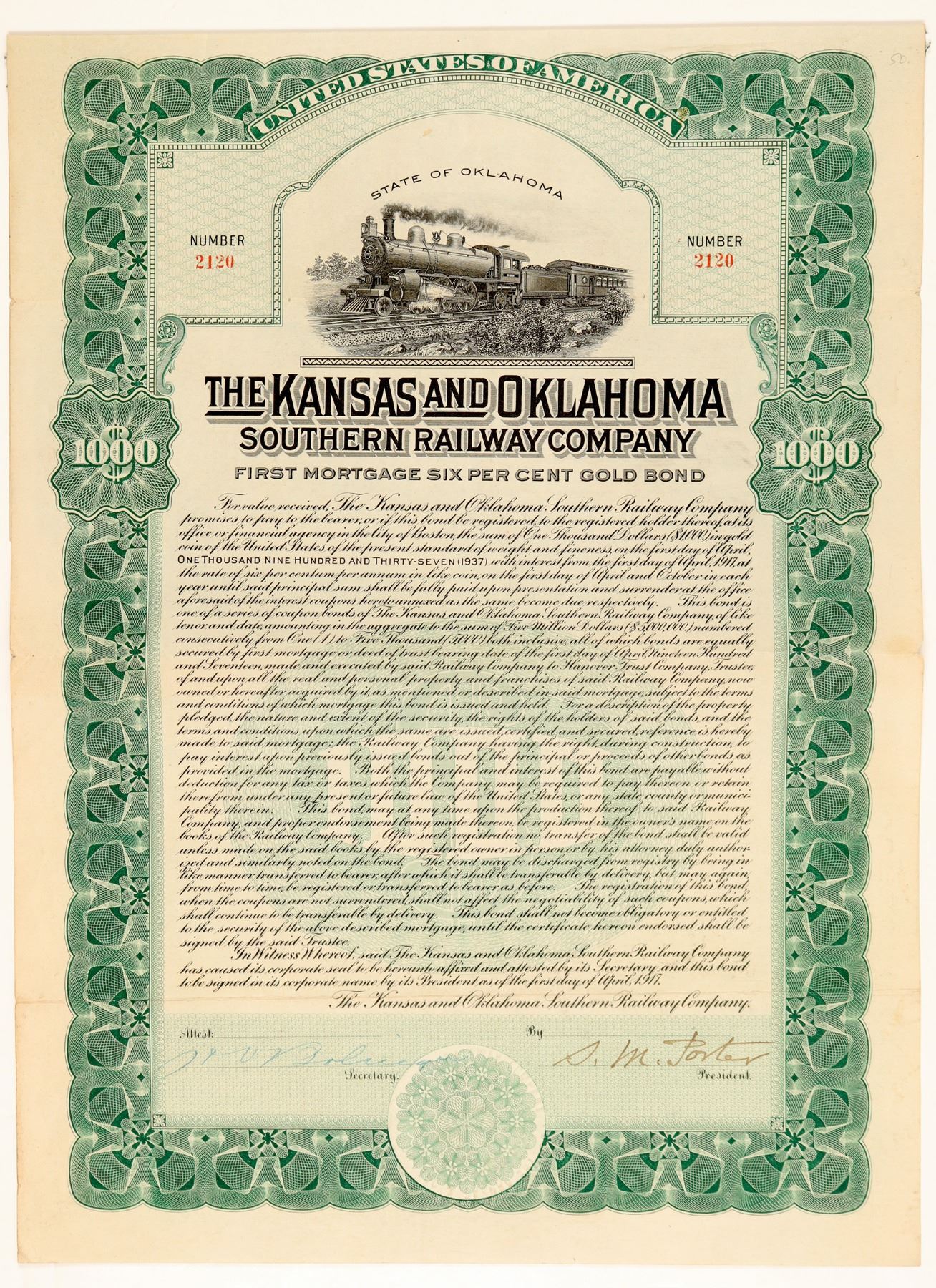 #2120 of 5000 authorized. I/U, $1000 6% First Mortgage Gold 20 yr. bearer bond due 1937. Issued April 1. 1917. Signed D.M. Porter President, GREEN, embossed seal, vignette top 4-4-2 loco #5122 r-l countryside. "1000" in white outline overprint middle of "$" green underprint. Coupons #18-40 attached. National Bank Note Co. printer . VF Ken Prag Collection