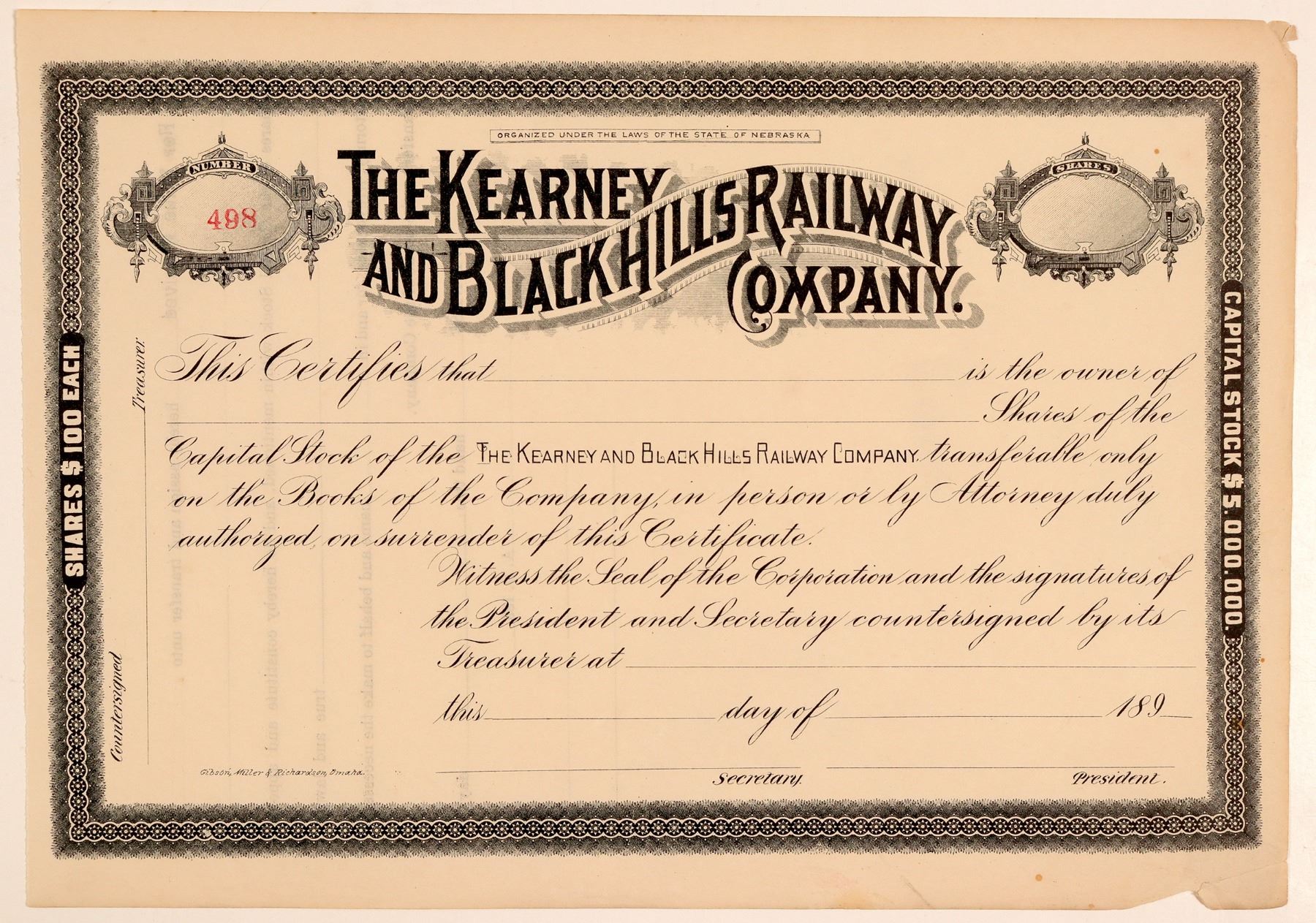 #498, unissued/uncanceled (U/U), common stock @ $100 par. $5,000,000 capital. BLACK, no vignette. Wavy company title top and block lettering in body of certificate. Dated 189_. Gibson, Miller & Richardson printer. Ken Prag Collection