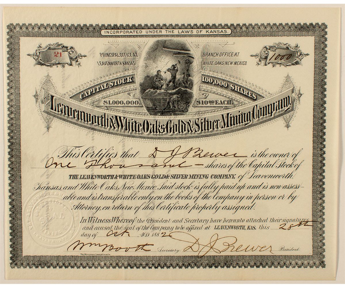 Cert. #21, issued at Leavenworth, KS in 1882 to D.J. Brewer for 1000 shares. Inc. in Kansas. Signed by Brewer as president and Wm. Booth as secretary. Principal office was a Leavenworth, Kansas with their branch office at White Oaks, New Mexico. The company operated the Senate claim in the Whiteoaks district. Printer: The Milwaukee Litho & Engr. Co. VF.City: White OaksCounty: LincolnState: NMDate: