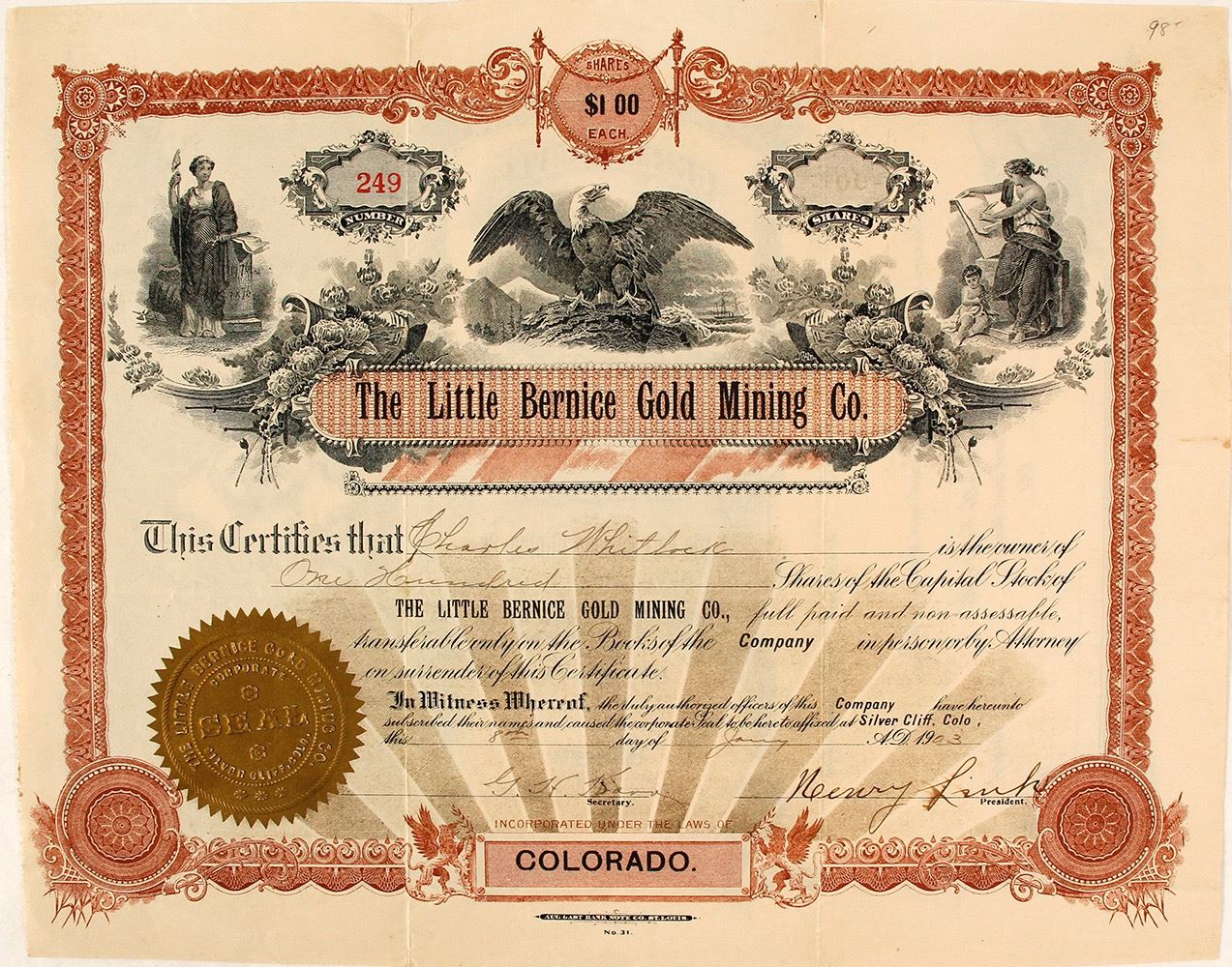 Similar design to other, but maroon border. No. 249, issued for 100 shares to Chas. Whitlock on Jan. 8th, 1903. Signed by Henry Link, president, and G.H. Kerr, the company secretary. Not cancelled. Multiple large allegorical vignettes. Printed by Aug. Gast Bank Note Co., St. Louis. 9.75 x 12" Deep folds, otherwise very fine. Not in Filer. According to The Mining American Vol. 46, the company owned the Valley View mine and were extracting good ore from it. They also operated the Little Bernice group of mines located on Iron Mountain. The ore was running as high as 105 ounces silver per ton. (Al Adams Gold Rush Memorabilia Collection) Date: Location: Silver Cliff, Colorado HWAC# 58535