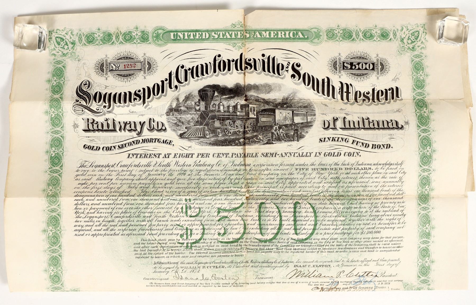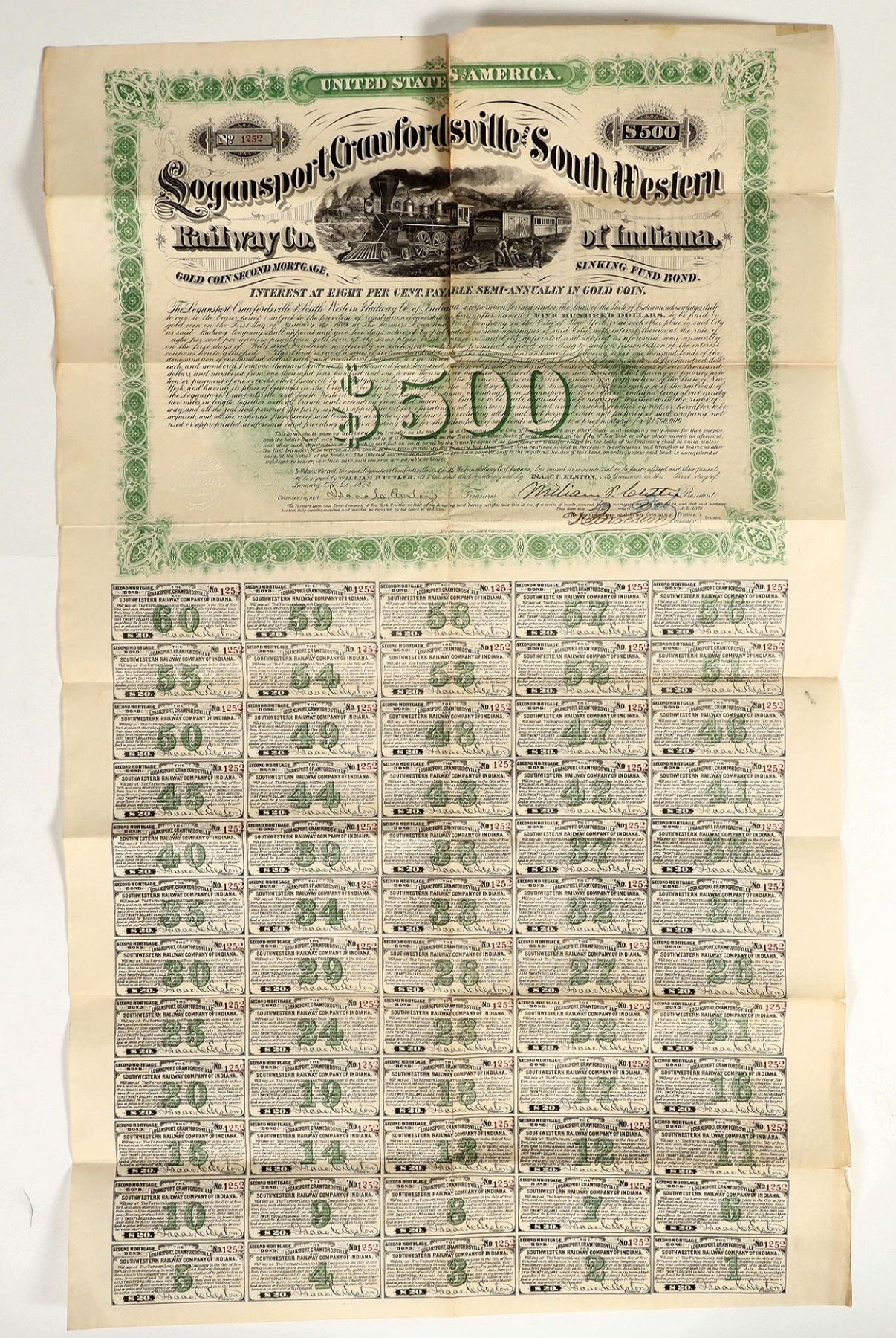 I/U, The Logansport, Crawfordsville & South-Western Railway Co. $500 gold bond.8%. Issued Jan 1873. All 60 coupons attached. There is a fold separation at the top of the bond. Strobridge & Co. printer. Story included.