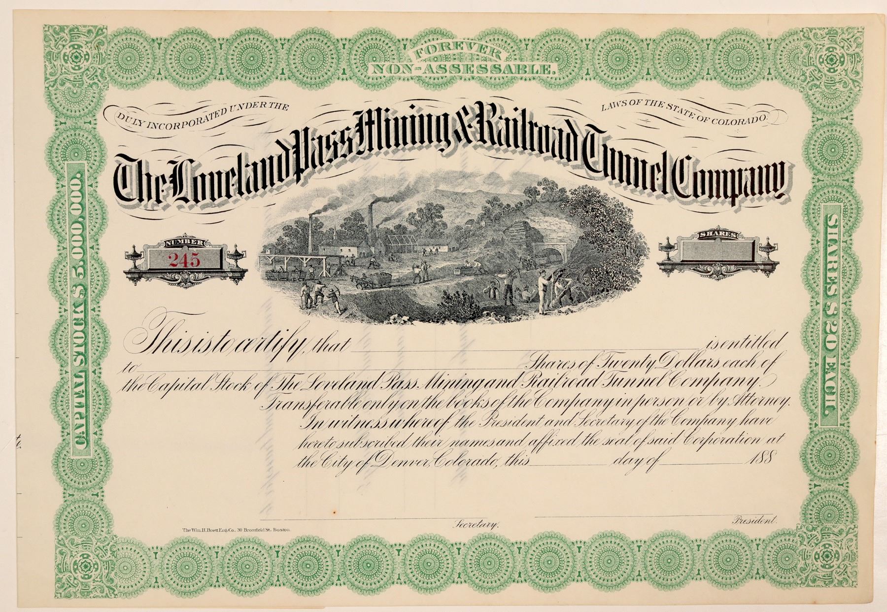 #245, U/U, shares @$20 par. Printed date 188_. GREEN, vignette of men working mine tunnel / factory/hills. Receipt attached. Wm. H. Brett Eng Co printer. Research shows this companies certificates have only existed in private collections. This is one of two offered in this auction. EF cond Ken Prag Collection