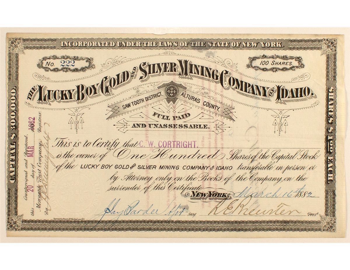Cert. #222, issued at New York in 1882 to C.W. Cortright for 100 shares. Signed by R.E. Reuster as president and J.Jay Pardee as asst secy. Operated the Lucky Boy mine in Jake's Gulch, off Beaver Creek, 25 miles east of Atlanta in the Sawtooth mining district. Generally a silver producer. Ore was shipped to the Vienna mill, a few miles from the mine. VF. Unc.City: Saw ToothCounty: AlturasState: IDDate: