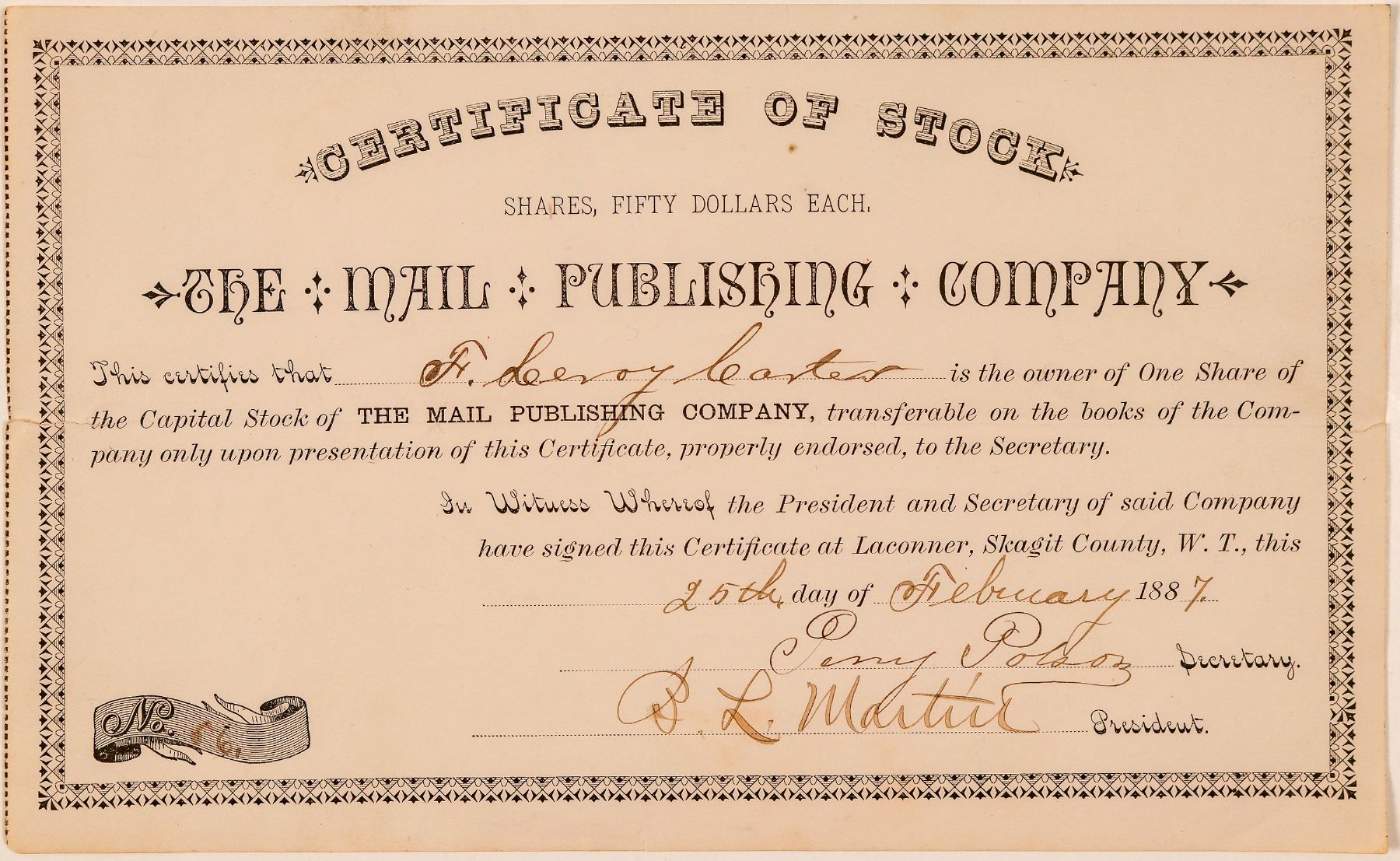 No. 56, issued for one share to F. Leroy Carter on Feb. 25th, 1887 in Laconner, Skagit County, Washington Territory. Signed by president B.L. Martin and secretary Perry Polson. Not cancelled. Black border and print, no vignette. No printer listed. 5.5 x 9" Horizontal fold with separation on each end. The Puget Sound Mail was founded as the Bellingham Bay Mail on July 5, 1873, by James A. Power as editor and publisher. Mr. Power moved his paper to La Conner and on September 13, 1873, it appeared under the name, Puget Sound Mail. On October 1, 1885, Mr. Power sold out to the Mail Publishing Company. Henry McBride and R. O. Welts continued as editor and manager until February, 1887, when the stock of the company passed to Leroy Carter and June Henderson. [Ref: Pacific Northwest Quarterly, Volume 13, 1922] Ken Prag Collection