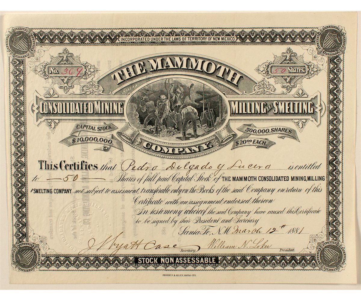Cert. #369, issued at Santa Fe, N.M. in 1881 to Pedro Delgado y Lucero for 50 shares. Signed by Willam N. Loker as president and J. Hyatt Chase as secretary. Inc. in the Territory of New Mexico. Miners underground vignette. Rhode's and Allen, Kansas City, printer. EF. Uncancelled.City: Santa FeCounty: Santa FeState: NMDate: