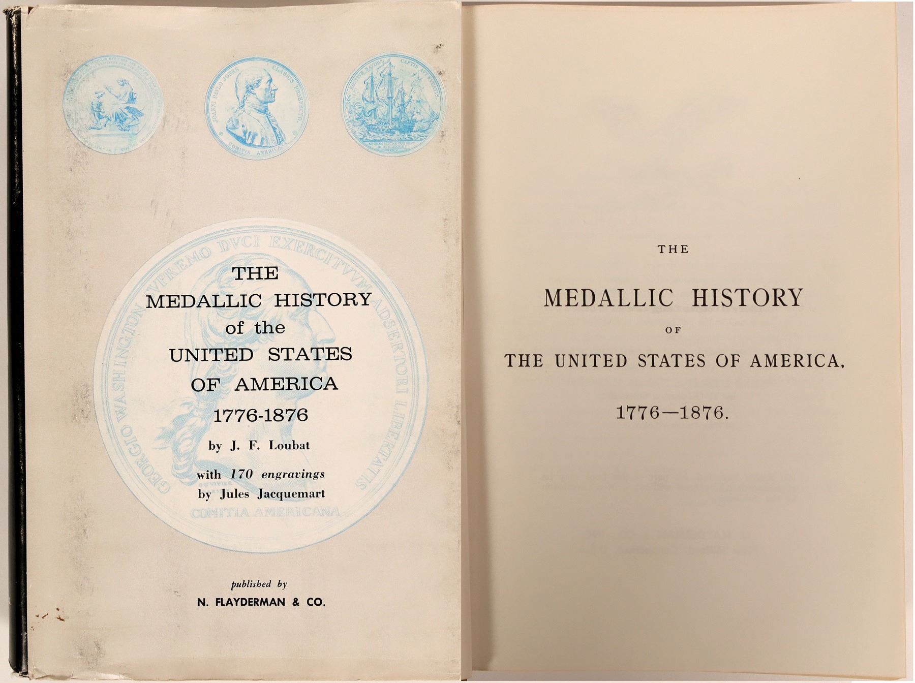 Lot of 1. The Medallic History of the United States of America, 1776-1876 by J. F. Loubat with 170 engravings by Jules Jacquemart. Published by N. Flayderman & Co. Dust jacket included. This is considered an early work of US medals.