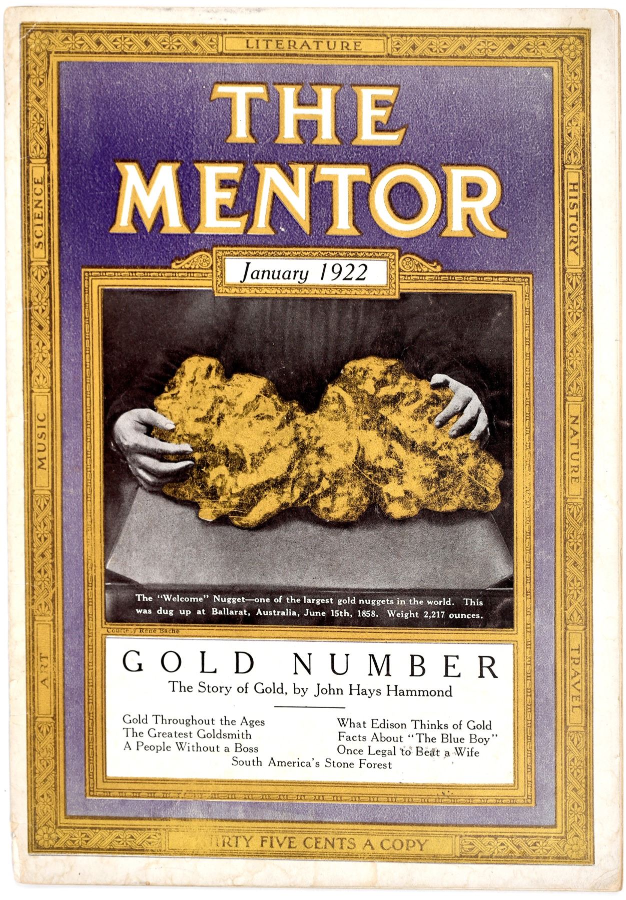 Exceptional mining publication called "The Mentor." Vol. 9, No. 12 issued January 1, 1922. Published monthly by the Crowell Publishing Company at Springfield, Ohio. Contains an article called "The Story of Gold," written by John Hays Hammond. Hammond was a world-famous mining engineer. 7 x 10 inches. Very good condition.