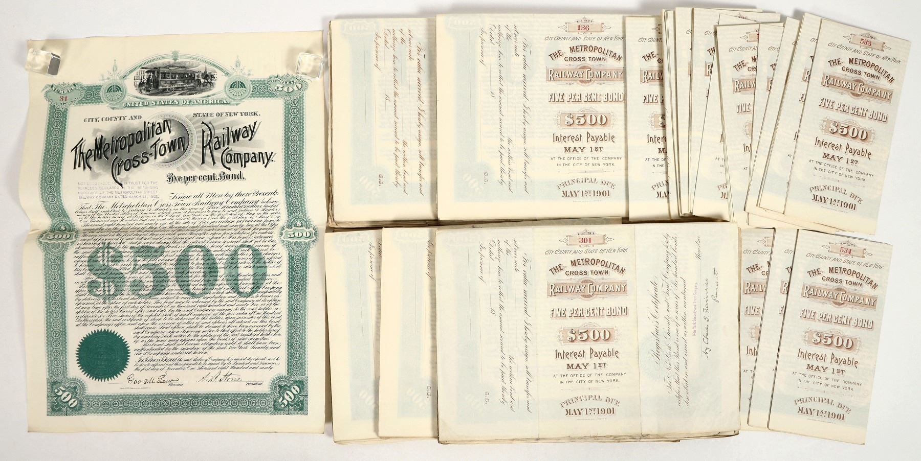 200+. I/U. Issue 1890. Fine or better. The Metropolitan Cross-Town Railway Co. Bonds, some with coupons, $500 & 1000, 5% bearer bonds. Two varieties. International BNC and Henry Breibert & Bros. printer.