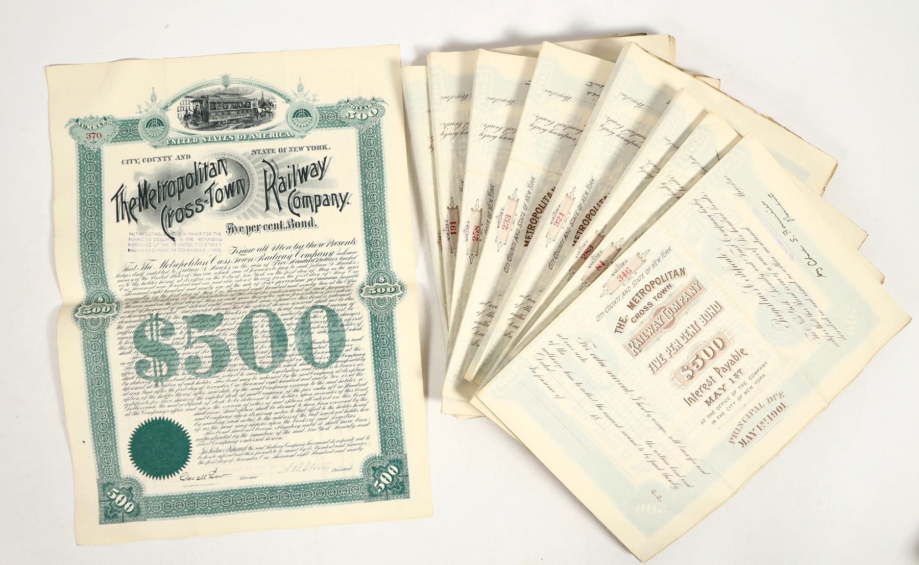 200+. I/U. Issue 1890. Fine or better. The Metropolitan Cross-Town Railway Co. Bonds, some with coupons, $500 & 1000, 5% bearer bonds. Two varieties. International BNC and Henry Breibert & Bros. printer.
