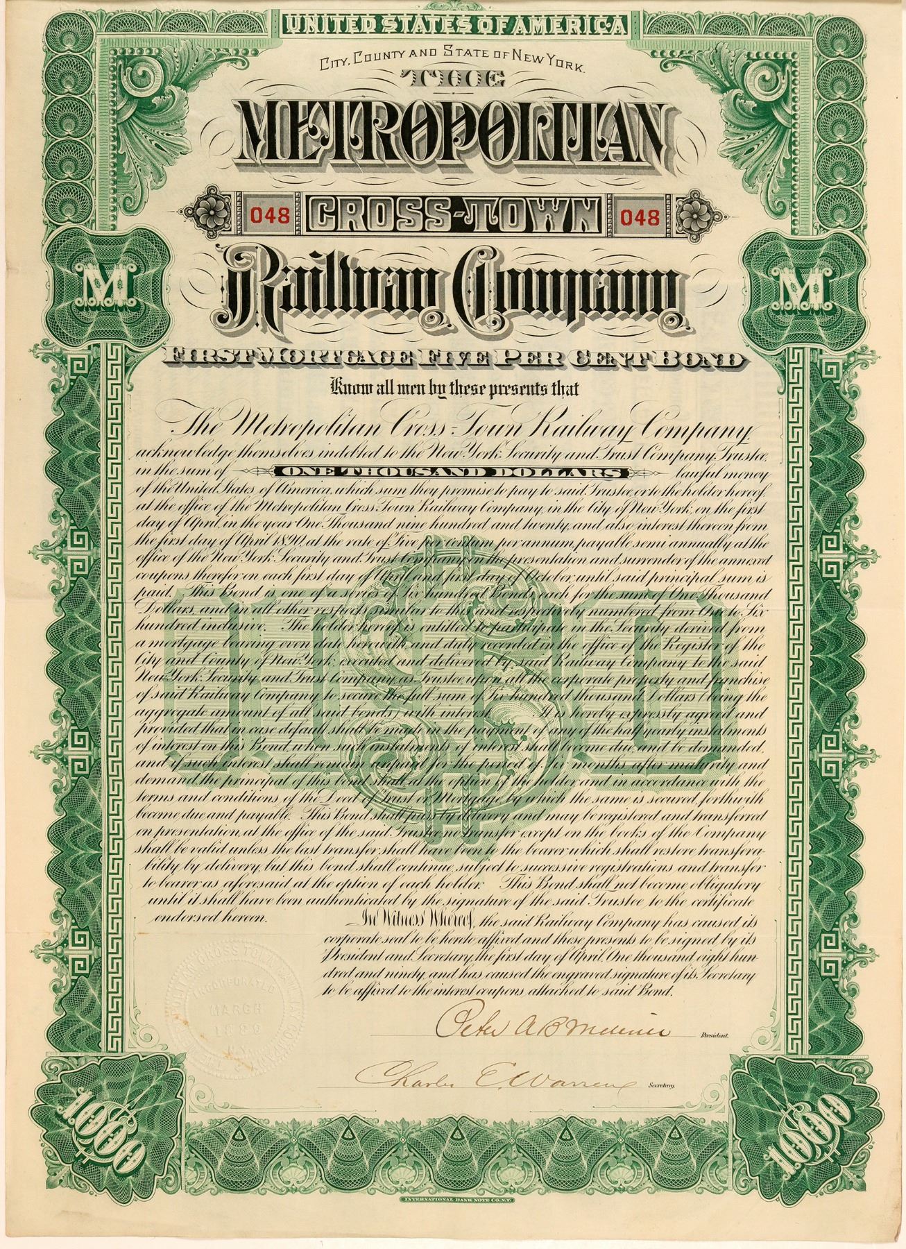 #048 of 600, I/U. $1000 5% First Mortgage Bearer Bond, due 1920. Issued April 1, 1890, signed Peter A.B. Muenier president, GREEN, embossed seal, no vignette, ornate title, "1000" "$" green underprint, 1000 printed lower corners, coupons #38-60 attached (allegorical female vignette), International Bank Note Co. printer. EF+ condition. Ken Prag Collection