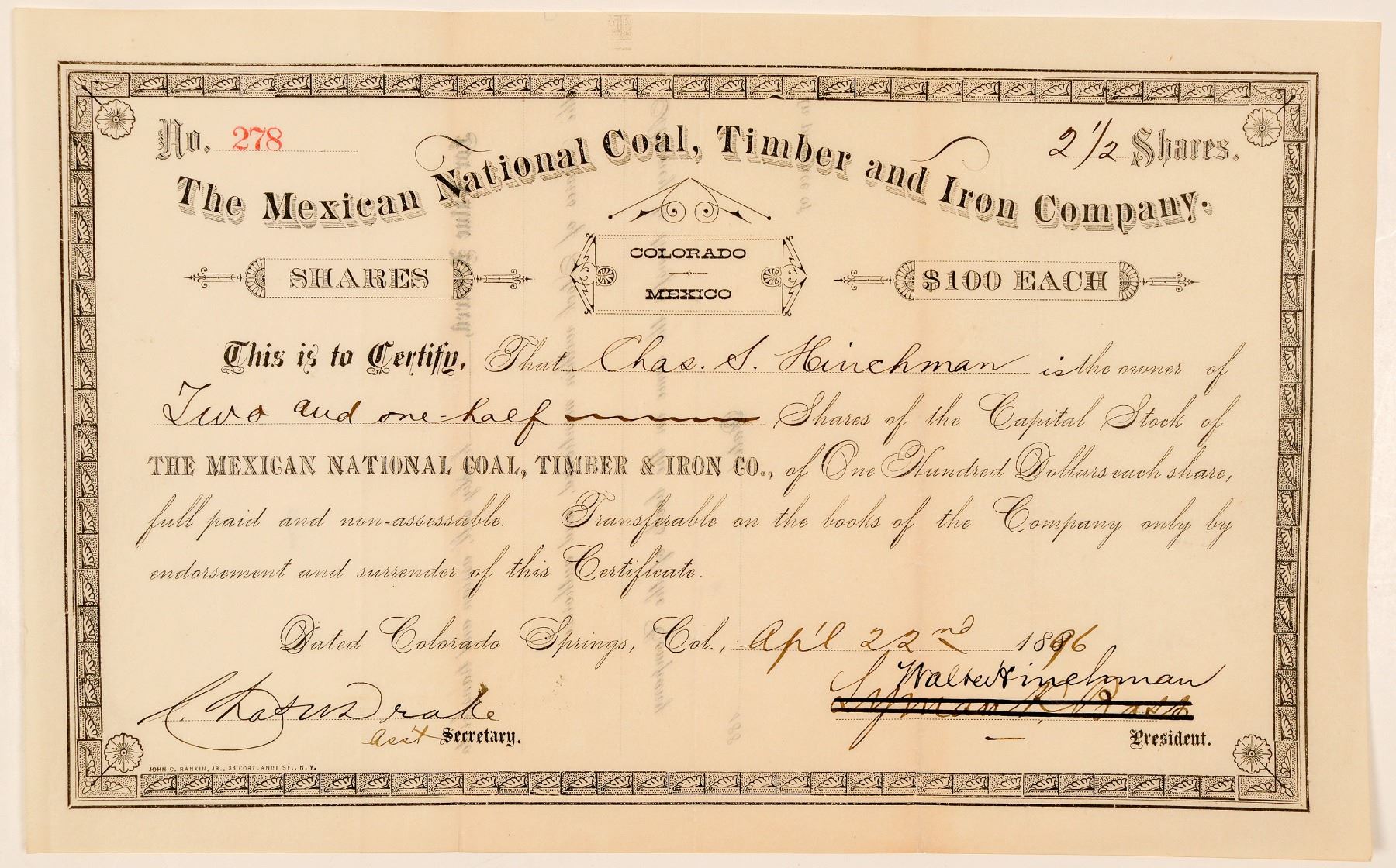 Dateline Colorado Springs, April 22nd, 1896. No. 278, issued for 2.5 shares to Chas. S. Hinchman. Signed by Walter Hinchman as president and asst. secretary Drake. Not cancelled. Black border and print. Folds, curled bottom right corner. "Colorado/Mexico" printed on certificate, but the company's main focus were the Santo Tomas coal fields at Las Minas, Webb County, TX. () Ken Prag Collection