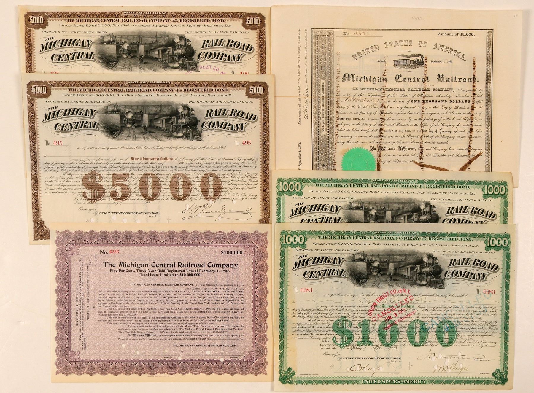 Total of six bonds. One Black, $1000, issued Sept 1, 1854. One purple , U/U, $100,000 note dated 190_, AmericanBank Note Co. printer. Two, I/C, $5000, BROWN, 4% First Mortgage Tax Free, #128 I/C issued Jan 23, 1891 and #495 U/C , but signed. Both "$5000" brown underprint, American Bank Note Co printer. Two $1000 4% First Mortgage Tax Free, GREEN , #0383 I/C, issued April 29, 1893 and #0248 U/C, dated 189_. signed name hole punched. All have the same vignette of two trains l-r in train yard. Ken Prag Collection