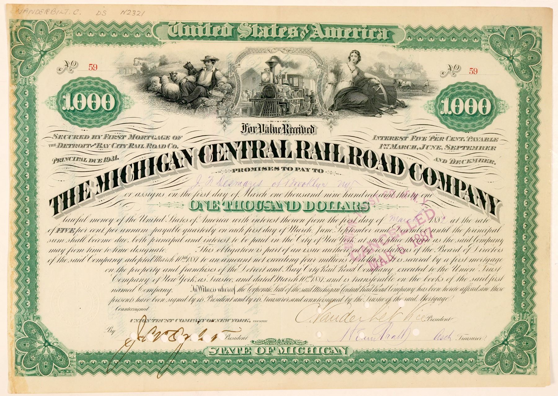 I/C, #59, $1000 5% First Mortgage bearer bond due 1931. Issued March 1, 1881 signed C. VANDERBILT V. President, cancelled Mar 5, 1887 (purple stamp), GREEN, embossed seal, vignette top man w/sheep left of $-$-0 loco r-l depot w/ female on right, "ONE THOUSANd DOLLARS" green overprint, American Bank Note Co. Cancel hole punches, no tears, stains, light fold creases. Ken Prag Collection