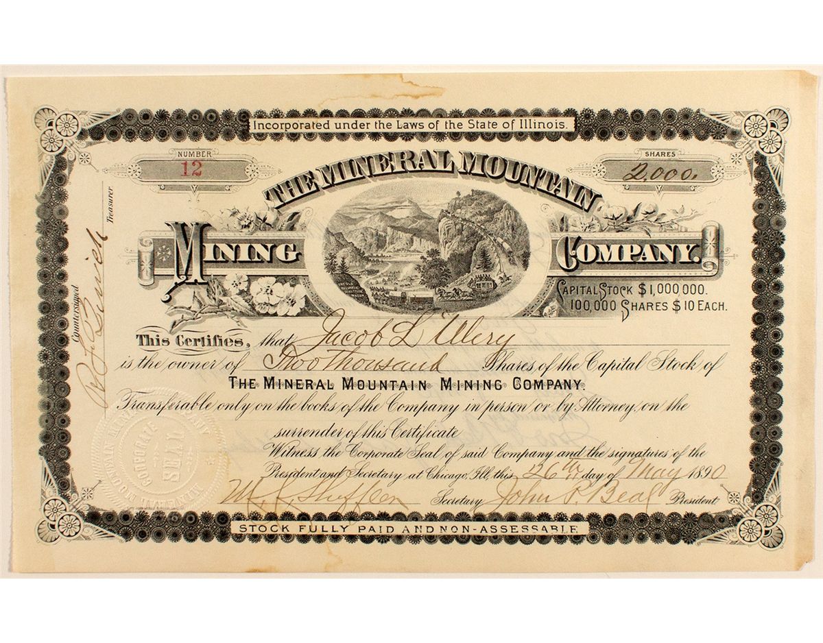 Cert. #12, issued at Chicago, Ill. In 1890 to Jacob L. Ulery for 2000 shares. Signed by John P. Beal as president and M.K. Shefflen as secretary. Great vignette of a wagon road with covered wagons and a stagecoach. In tiny letters it reads, "The Old Reliable Schuttler Wagon." The company's mines were located south of Cottonwood Canyon on the west slope of Mineral Mountain in the Santa Rita Mountains, Arizona. Very rare certificate. Slight browning. Near fine. Unc.City: County: Santa CruzState: AZDate: