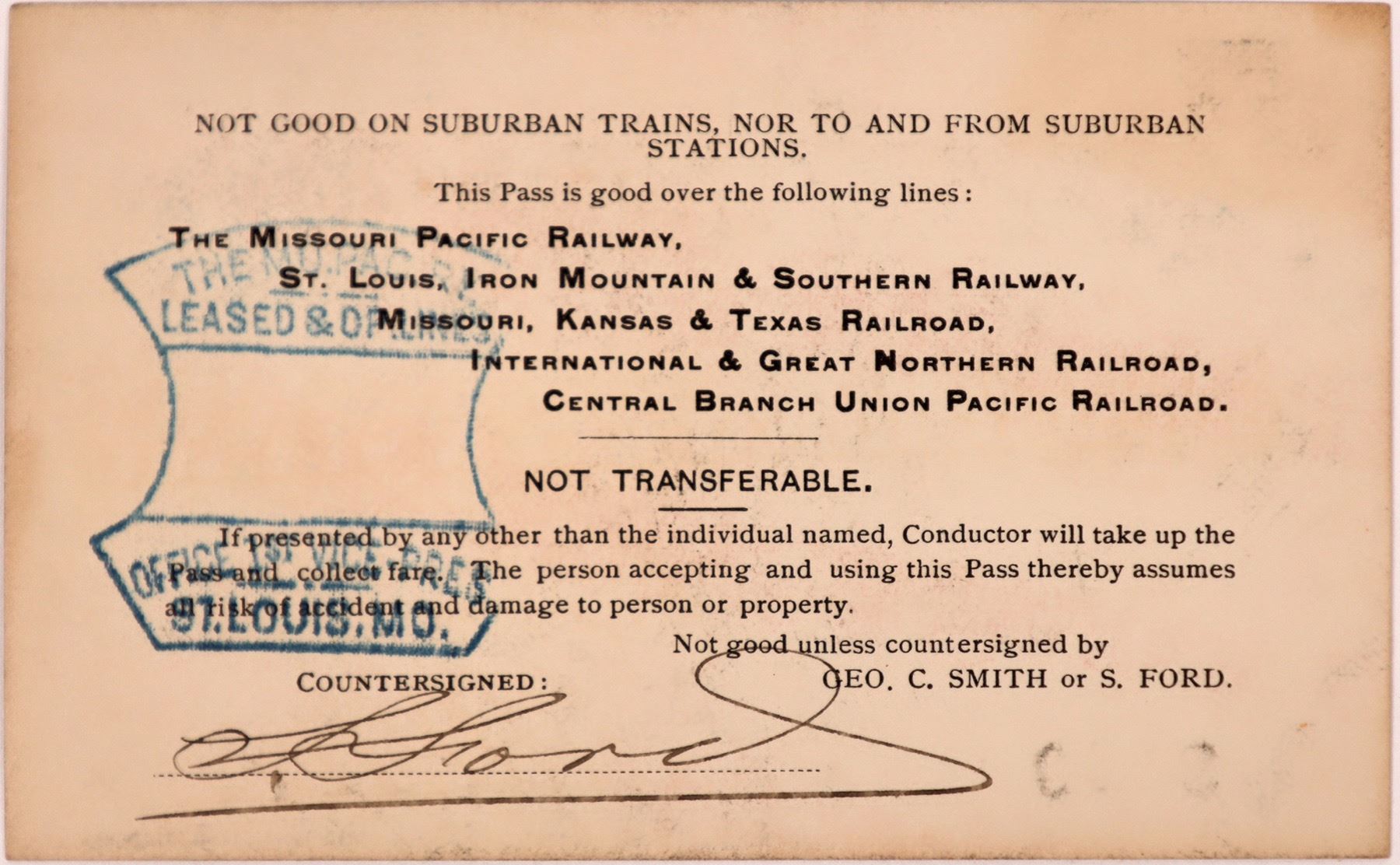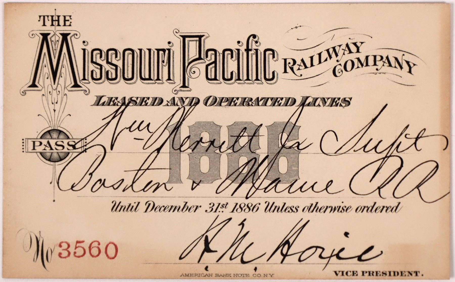 The Missouri Pacific Railway pass, notice underprint date of 1886 on front. Unique blue stamp on reverse. Signed by the office of the vice president on front. No. 3560. Please see photos for condition.
