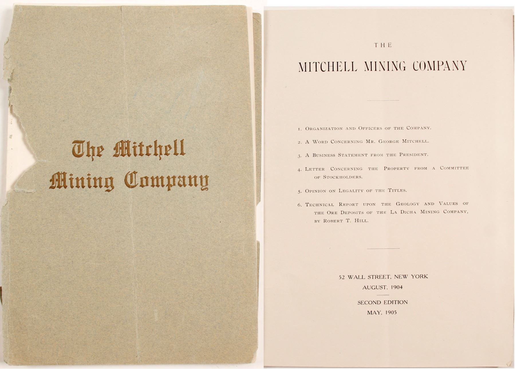 The company incorporated 1902 State of Arizona Report on the holdings of the Mitchell Mining Co a total of 64 pages with black and white photos, maps, drawings on geological structures. The outside cover is torn and separated, the inside pages and photos are all in good condition of local habitants, nines and structures with no tears or markings. In protective sleeve. State: Mexico City: Guerrero Date: HWAC# 84624