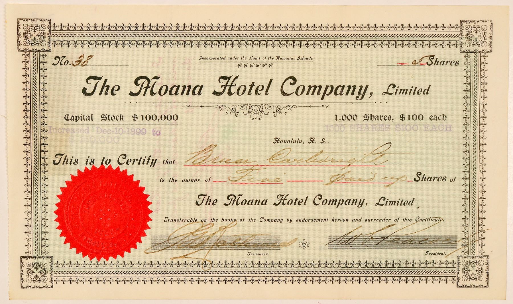 Inc. under the laws of the Hawaiian Islands. No. 38. Issued for 5 shares to Bruce Cartwright (son of the "father of baseball," AJ Cartwright). Dateline Honolulu, H.I. 1900 date from stamps on back. Signed by the president (WC Peacock) and secretary. Not cancelled. Red seal and green background. Blue one dollar Hawaiian revenue stamp on reverse. 6" x 10" with folds. Built in the late 19th century as the first hotel in Waikiki, the Moana opened in 1901. The wealthy Honolulu landowner Walter Chamberlain Peacock, in an effort to establish a fine resort in the previously neglected Waikiki area of Honolulu, incorporated the Moana Hotel Company in 1896. Ken Prag Collection