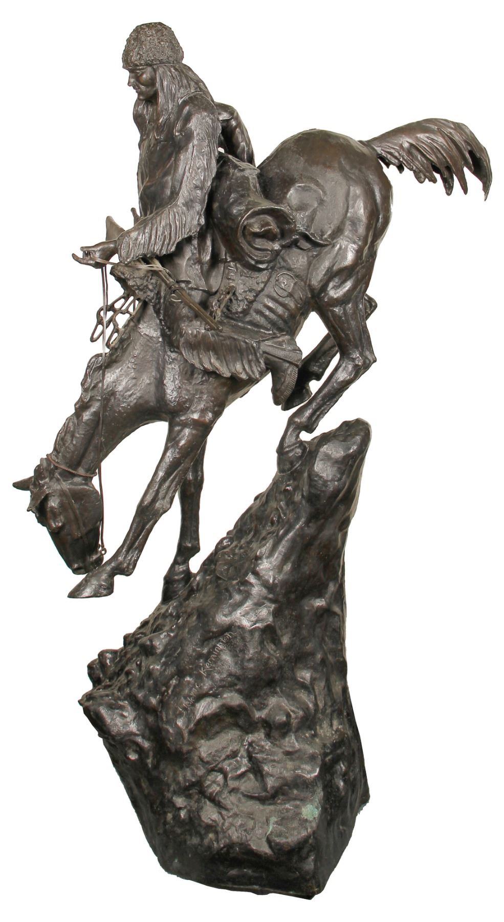 Remington described “The Mountain Man” as one of the "old Iroquois trappers who followed the Fur Companies in the Rocky Mountains in the 1830's & 40's,". No. 17/50. Original 27" is shown at the Metropolitan Museum of Art in New York. The Bronze was done in 1907. The shipping will be expensive due to weight. Preferred local pickup. Copyright ASB, may be Artistic Solutions of San Bernardino, California. This is the largest reproduction of Remington Bronze that we have seen. More than five feet tall at 64" x 38". This will make a dramatic display in any home or business. Brian Thaler Collection