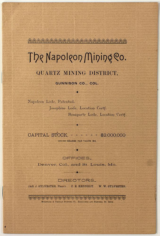 The Napoleon Mine was situated in the Quartz Creek Mining District. From a report: the underground workings in the mine are all free from water and perfectly dry. With my three years' practical experience in working the Gold Cup Mines, I feel very confident that Napoleon group of mines are all of great promise and with proper development, the property will make one of the best producing mines in this camp." The prospectus in in great condition and includes a folded sheet offering shares.