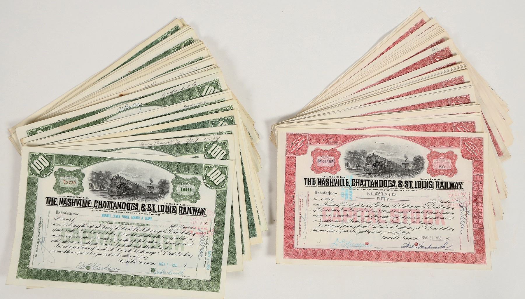 Lot of approx. (200) stock certificates, issued by "THE NASHVILLE, CHATTANOOGA & ST. LOUIS RAILWAY." Nice locomotive vignette at top center. Certificates are punch and stamp cancelled, executed on the reverse sides with signatures, and multiple stamps. Overall condition is very good to excellent. Many certify that they were issued to Merrill, Lynch, Pierce Fenner & Beane. There are (2) color variation in this lot. Please see photos.