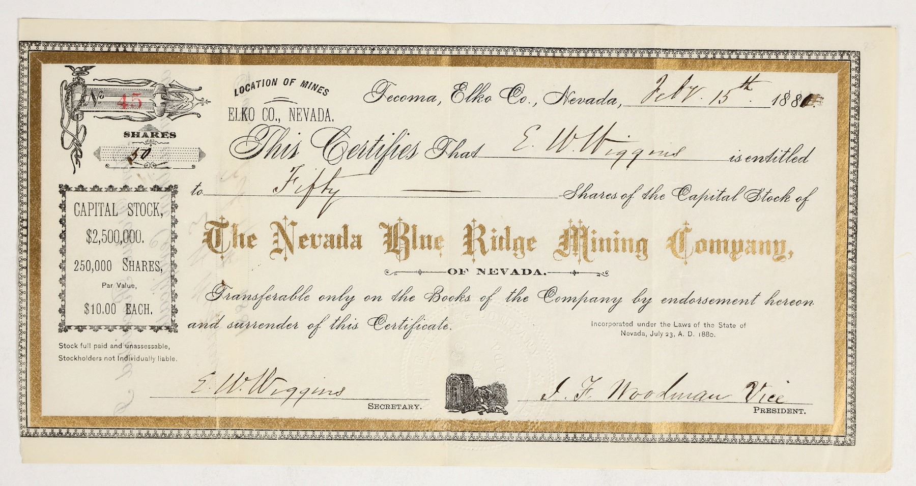 I/U. The Nevada Blue Ridge Mining Co. Stock, issued 1881, embossed seal, mine located in Tecoma, Elko County, Nev. Tecoma was known as a railroad stop for mines in other districts. Few local mining companies were ever formed. There was also a famous Blue Ridge Mine in Lander County.