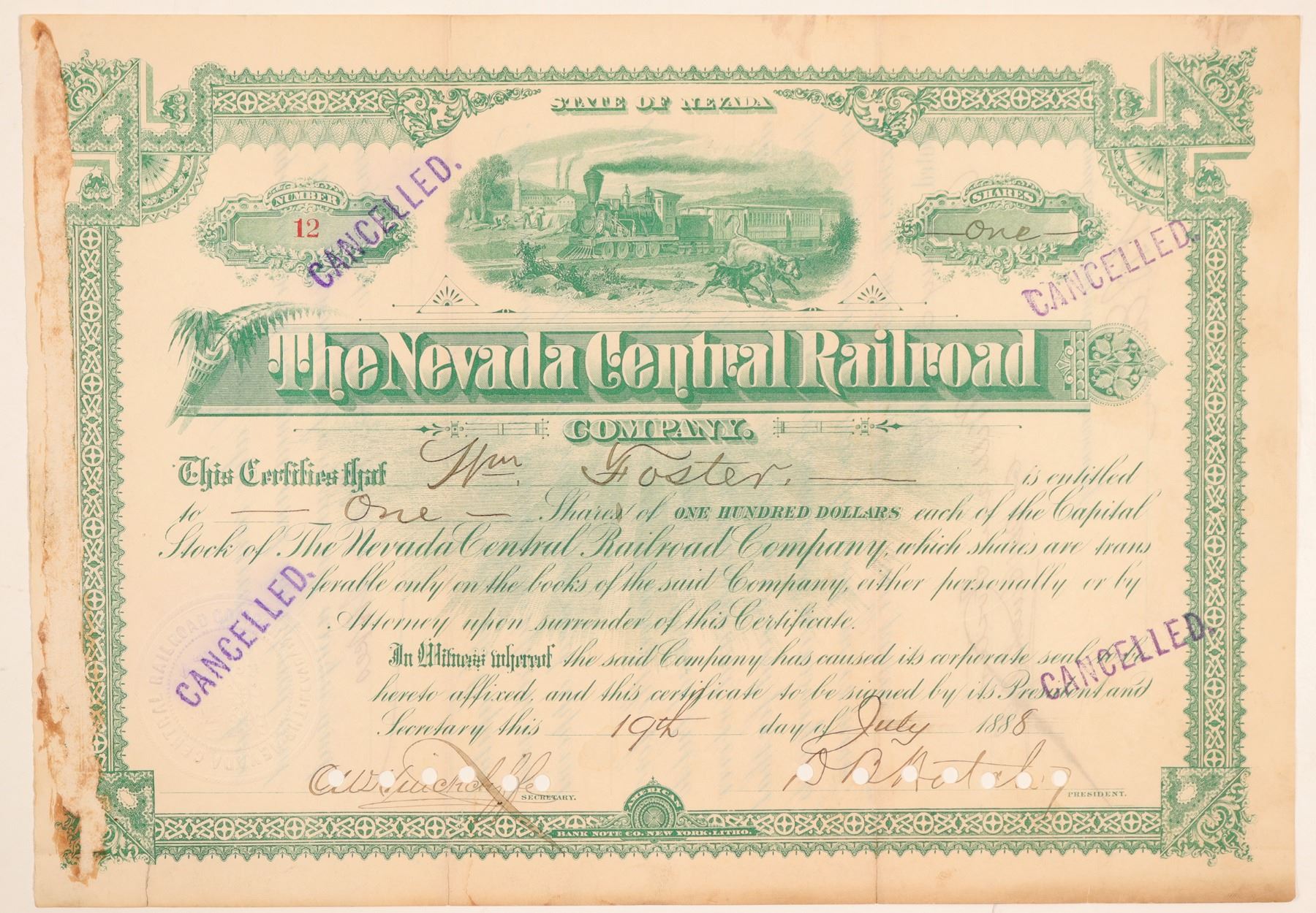 #12, I/C, one share of common stock @ $100 par. Issued to Wm. Foster July 19, 1888. signed , hole punched not readable. GREEN, Embossed seal w/4-4-0 loco center. Vignette 0-8-0 loco passing workers in field. Bank Note Co of New York printer. VF+ cond. Only 3 reported issued and dated 1889, this one was not known to exist. Ken Prag Collection