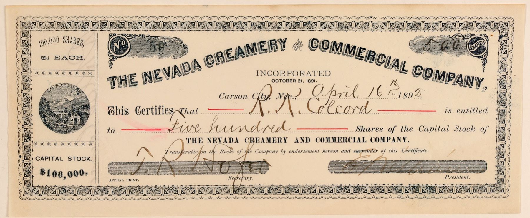 Inc. Oct. 21, 1891. No. 59, issued for 500 shares to R.K. Colcord on April 16th, 1892 in Carson City, Nevada. Signed by president E. Williams and secretary T.R. Hofer. Not cancelled. Ornate border and dark blue print. Small state seal vignette at left. Printed by Appeal Print. 4 x 9.75" Fold, very clean. They made and sold condensed milk, cheese, and butter from milk supplied by member farms in the Carson, Mason and Smith Valleys, Nevada; Lyon County, Nevada; and Novato, in Marin County, California. Became the California-Nevada Creamery Company. () Ken Prag Collection