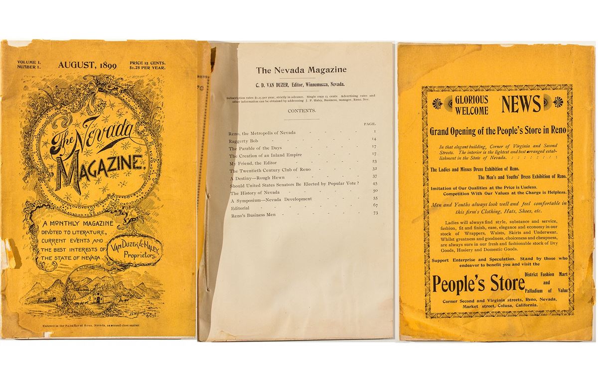 Rare! Vol. I, No. I. "A Monthly Magazine Devoted to Literature, Current Events and the Best Interests of the State of Nevada." Van Duzer & Haley, Proprietors. 78 pages plus Reno advertisements. Interesting historical reference that includes black and white photos. Chapters such as: "Reno, the Metropolis of Nevada"; "The Creation of an Inland Empire," or "The History of Nevada." Paper covers with rips and portions of the covers missing. Pages are mostly clean.