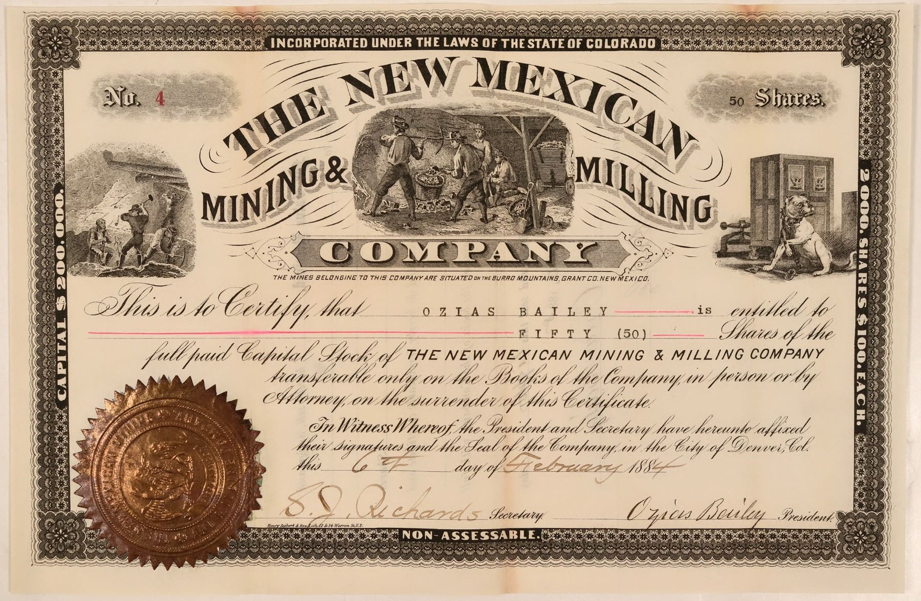 Inc. in Colorado. Low cert. #4, issued to Ozias Bailey for 50 shares in 1884 and signed by Bailey as president. S.J. Richards also signs as secretary. Three vignettes of miners underground at top center, dog and safe at right and more miners at left. "The mines belonging to this company are Situated on the Burro Mountains, Grant Co. New Mexico" printed under the vignette. Mining began in the Burro Mountains in 600 AD with Native Americans mining turqoise. Underground mining began here in the 1860's. The district contained a lot of low grade copper (mindat.org). This is a very nice certificate and very rare. We do not believe we have seen this one before and it's in very fine, uncancelled condition.