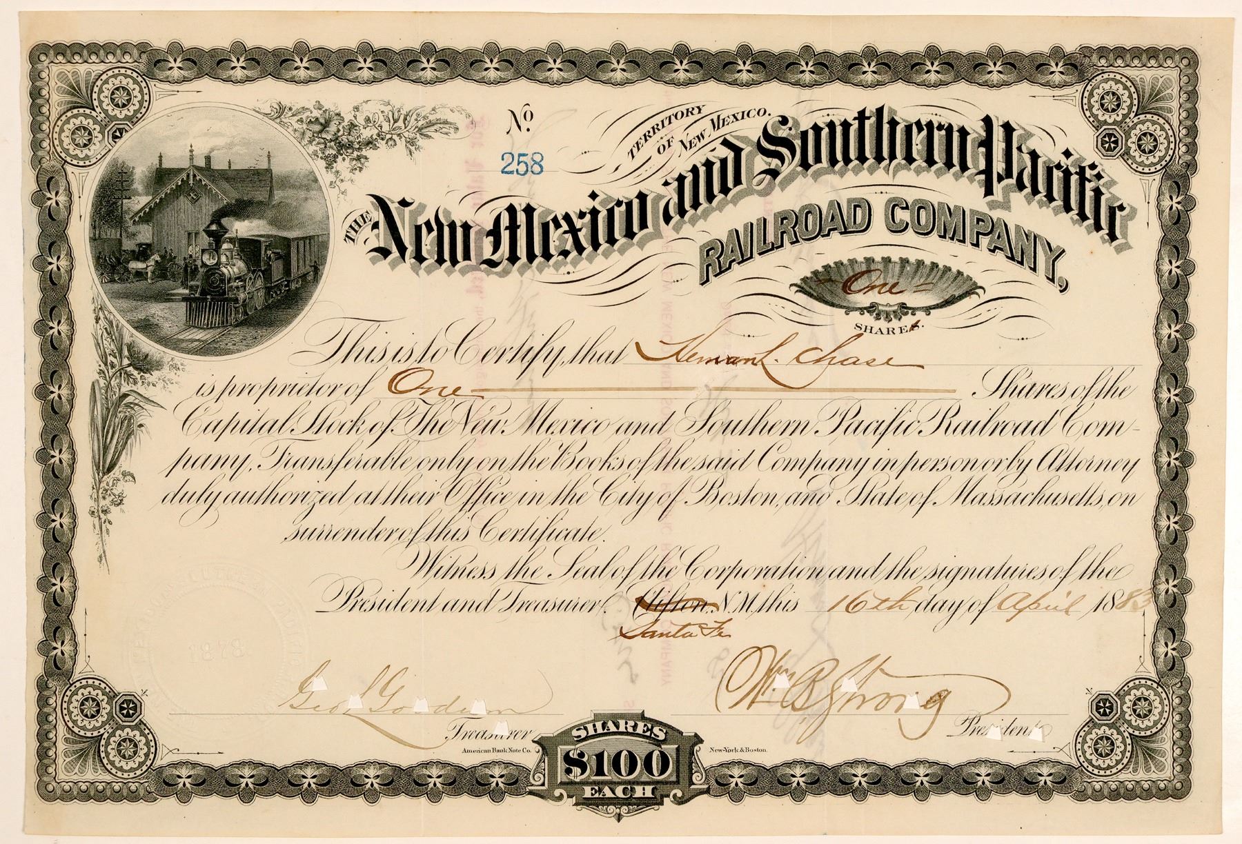 #258, I/C, 1 share of common @ $100 par issued to Hermann Chase April 16, 1883. Signed Wm. B. Strong President. BLACK on white paper, embossed seal, vignette 4-4-0 @ depot, this issue year was not previously known to exist. American Bank Note Co.. EF Ken Prag Collection