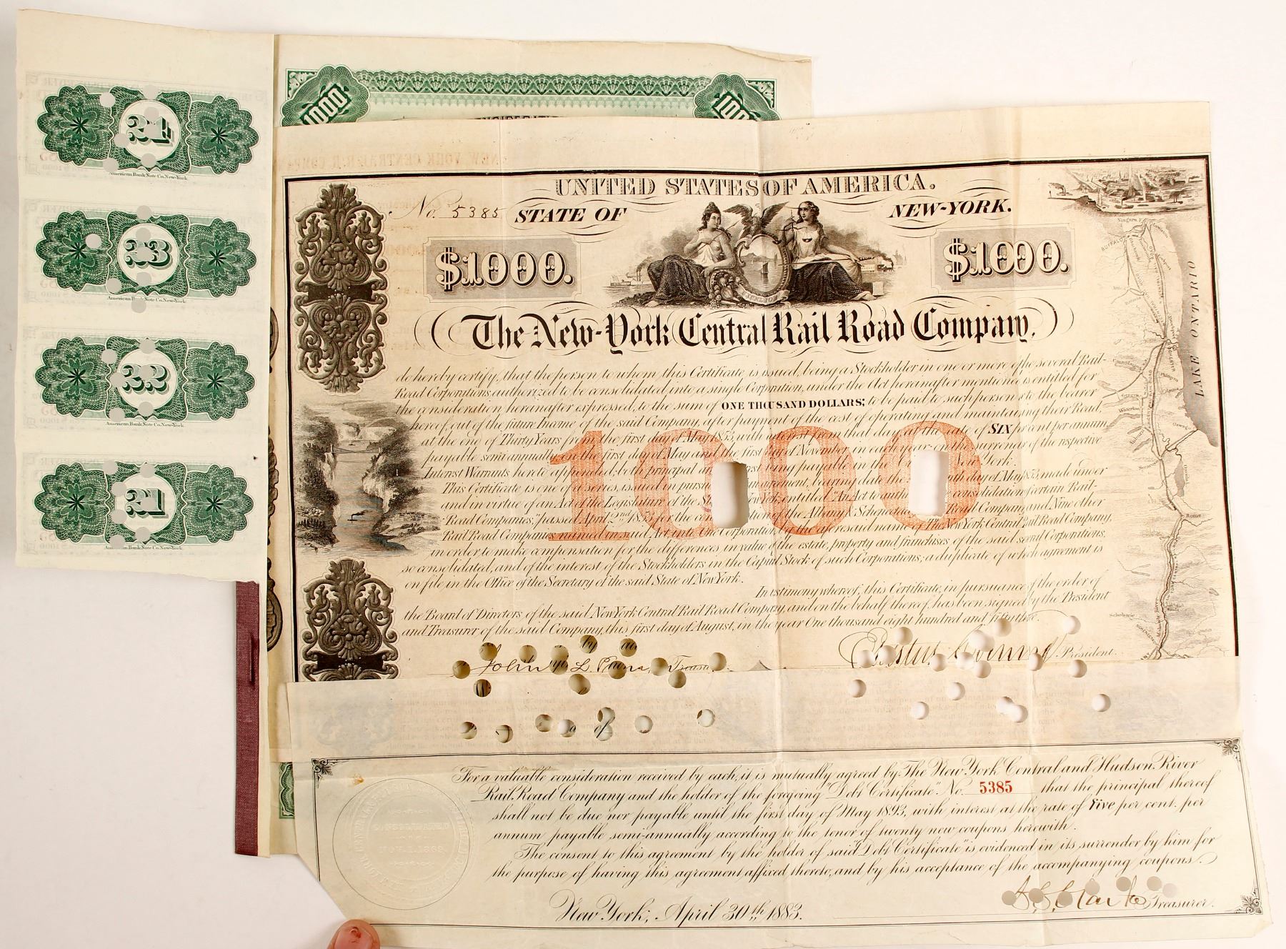 incorp. Nov 1, 1869 State of New York. I/C #5385, $1000 4% extended debt certificate, due 1905. Issued originally Aug 1, 1853. signed by Erastus Corning , black w, vignette of partial nude female on left and female on right of eagle center, map of railroad down right side, 1000 red underprint. Addendum attached amending to 5% w/coupons (attached) April 30, 1883. Then amended to 4% Dec 1, 1892 extending to 1905, green, embossed seal, 1000 green underprint, vignettes top state seal, American Bank Note Co printer.. Ken Prag Collection