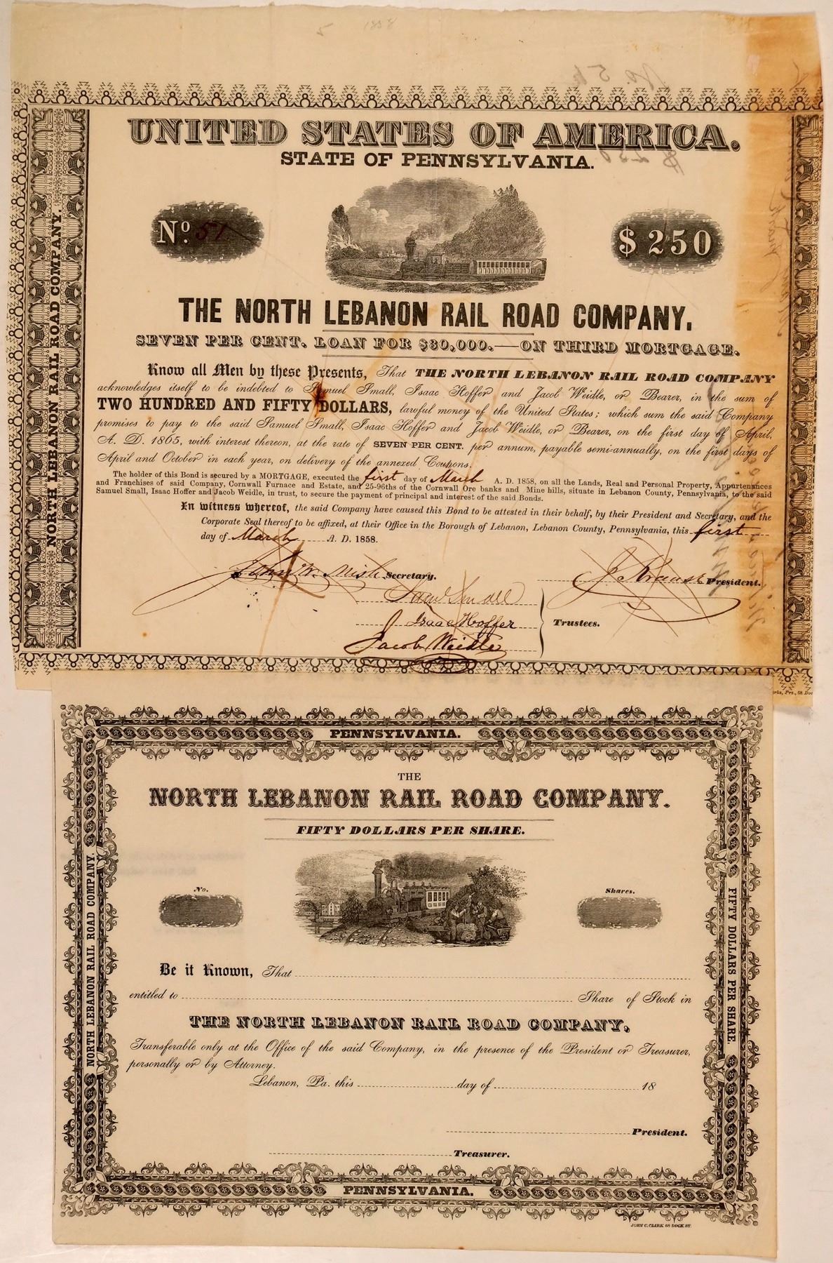 Two certificates. Incorp. 1850 Pennsylvania. U/U, not numbered, $50 par stock, Black, vignette cab-less train approached workman, John C. Clark printer. EF.