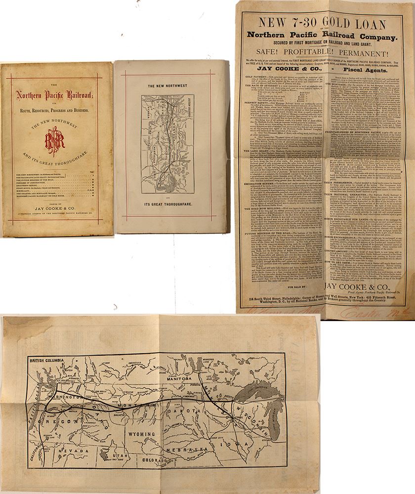 1) Includes a map 9 x 15". The publishers of this booklet, Jay Cooke and Company, were the financial managers and marketers of the Northern Pacific Railroad. They printed many pamphlets such as this one, extolling the nature of the northwest and the benefits of the railroad itself. The railroad held huge land grants, extending up to fifty miles to either side of the prospective tracks, and as such it was in the business of trying to sell the land to future settlers, prospectors, miners, or whomever would buy. Most of the transcontinental route on this map is still in the planning stages at this time- by the end of 1871 track had only reached as far west as Fargo, North Dakota. They would eventually get to the West Coast. Their route is now part of the Burlington Northern. 2) Also includes the 1877 Report of the President and Directors to the Stockholders. 18 pages. Includes a report on earnings and how different sections are faring.