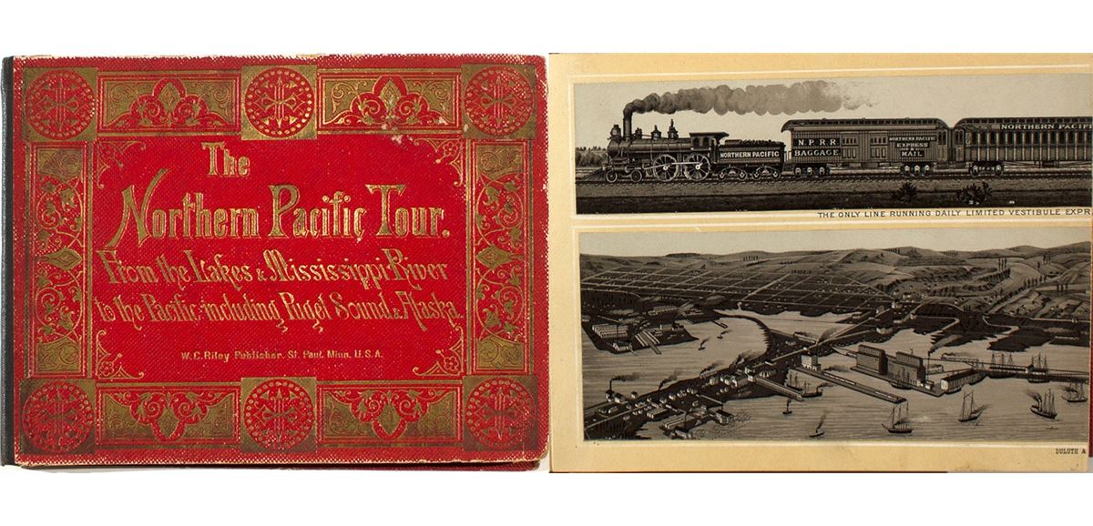 Foldout Picture Booklet. "From the Lakes & Mississippi River to the Pacific including Puget sound & Alaska". 29 pages. 7 1/2" x 9 1/2" Worn, loose binding and some fraying at edges