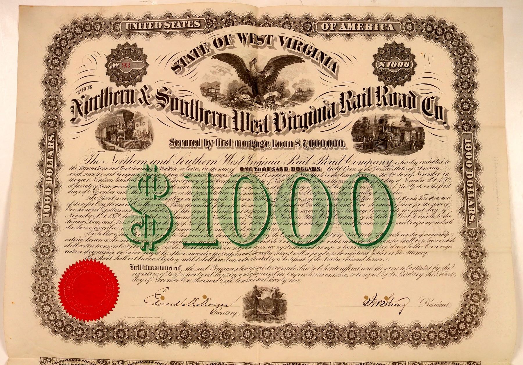 #93, I/C, $1000, 7% First Mortgage Gold bearer bond due 1902. Issued Nov 1, 1872. Signed J.W. Strong President. Black, red embossed seal, "$1000" green underprint, vignettes top eagle wings spread, left 4-4-0 l-r @depot, right 4-4-0 r-l @ depot. State seal bottom, Coupons 1-60 attached. E.S. Dodge & co printer. EF