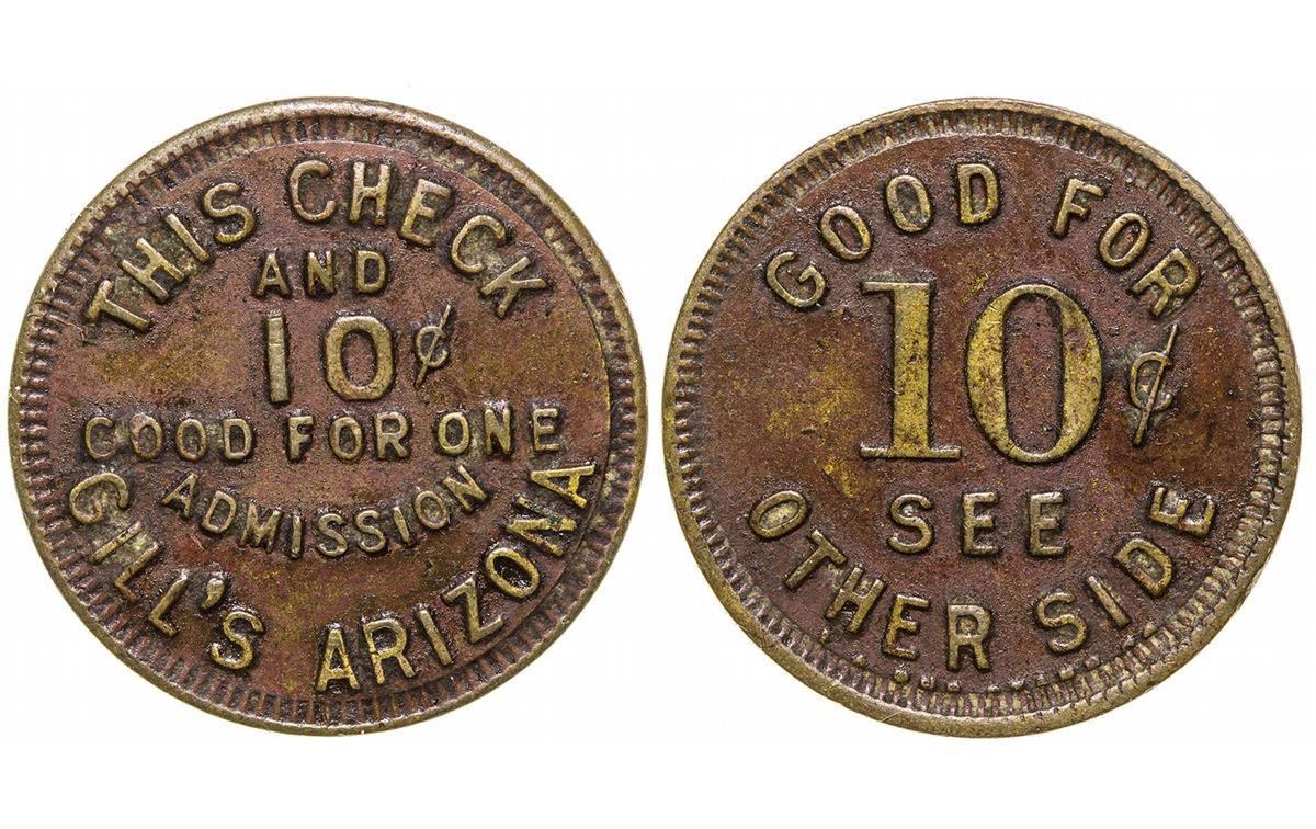 Obv.: This Check / and / 10c / Good for one / Admission / Gill's Arizona; Rev.: Good For / 10c / See Other Side; Br., 23mm, R8. Listed in Spooner as "location unknown."