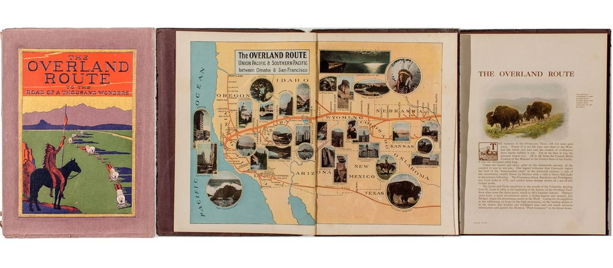 Issued by the Union Pacific and Southern Pacific Passenger Departments. "The route of the Union Pacific and Southern Pacific from Omaha to San Francisco. A journey of eighteen hundred miles where once the bison and Indian reigned." 72 pages with color illustrations of locations along the line, including Virginia City, Carson City, and Tahoe. Illustrated color softcover. Pages and spine are detached from covers. Pages in very good condition. Measures 11" x 8.25"