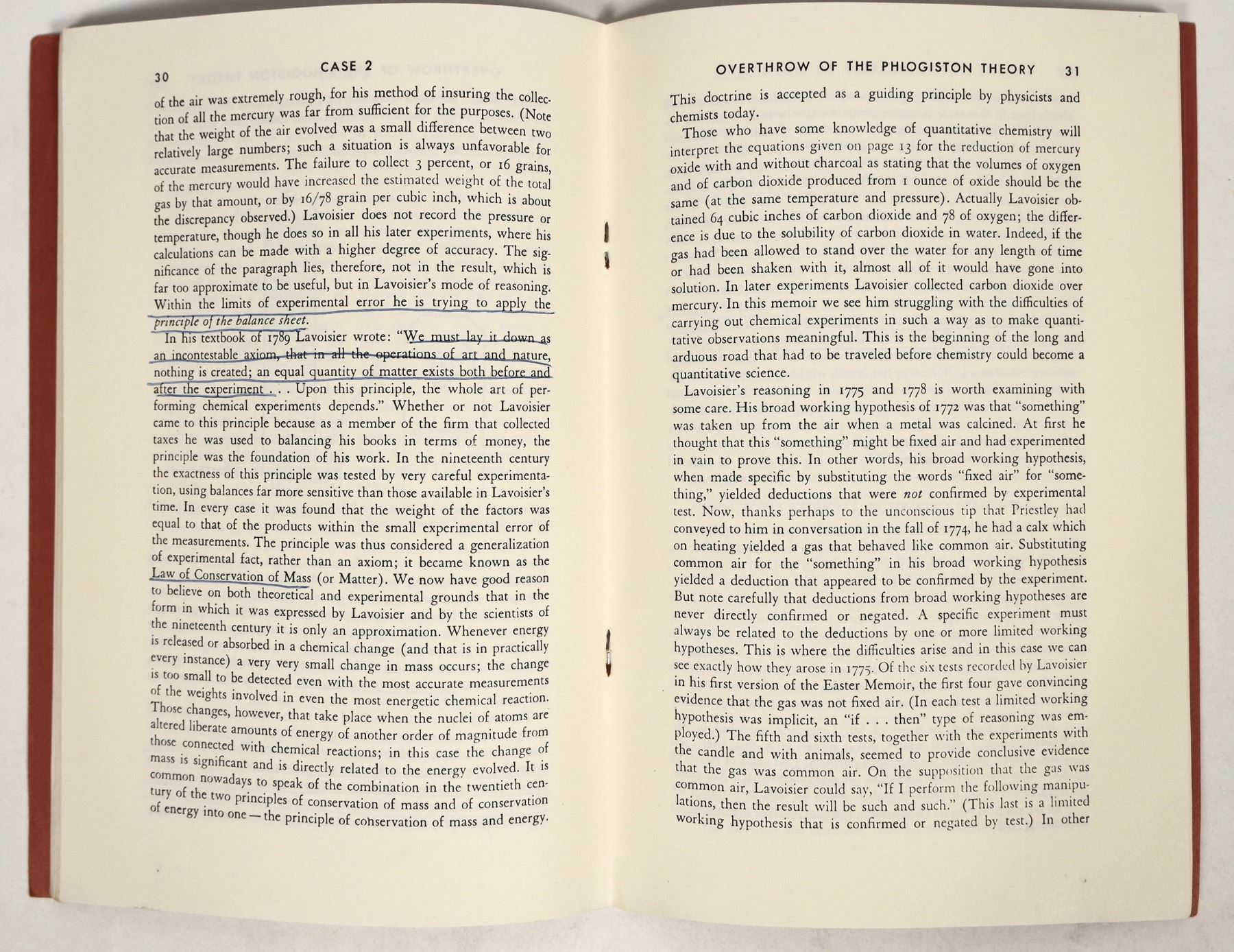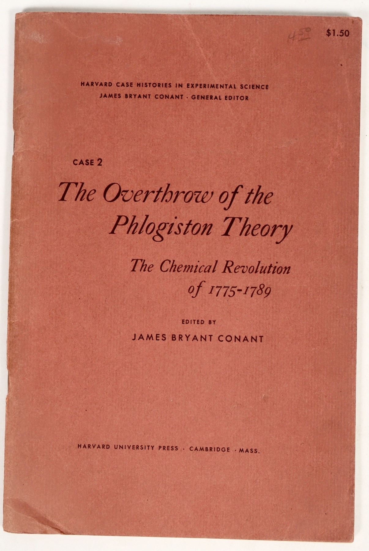 Rare and important. Harvard Case Histories in Experimental Science, James Bryant Conant, Editor. 1967. 59pp. Pen notations. The overthrow of the phlogiston theory occurred in the late 18th century when Antoine Lavoisier demonstrated that combustion and rusting were not due to the release of a fire-like element called phlogiston, but rather the chemical combination of substances with oxygen. Through careful experiments with closed systems, Lavoisier showed that mass was conserved and that oxygen played a central role in combustion and respiration. This shift marked the foundation of modern chemistry, replacing speculative ideas with quantitative experimental science and helping establish the chemical revolution.
