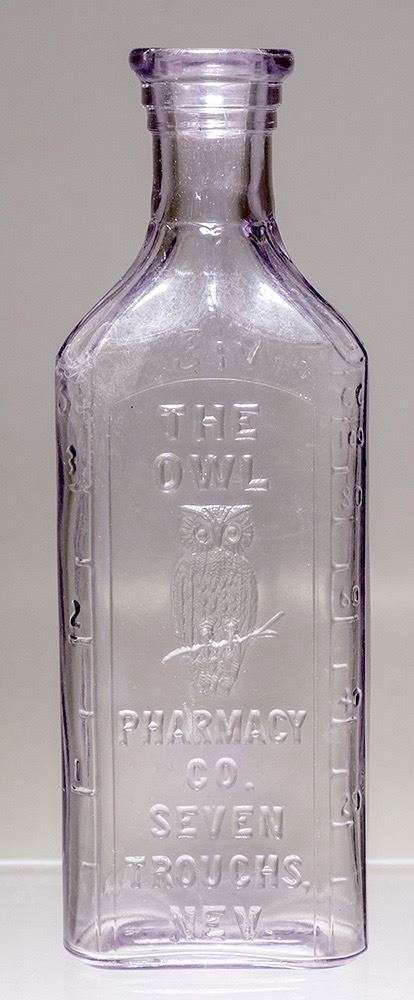 One of the top western medicine bottles. This is dead mint and purple. 4oz., 6" tall. Mold imperfection in making left rear corner. This is one of the finest examples known. A ghost town today in north central Nevada that has seen significant exploration for gold over the past 20 years. See Nevada Bottle Book Volume II page 239-242 for history on the Owl Pharmacy. Date: c1909-1914 Location: Seven Troughs, Nevada HWAC# 571643