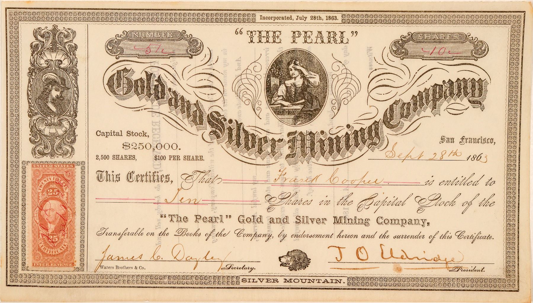 "Silver Mountain" printed on the bottom of the stock. Inc. three months before in 1863. No. 51, issued for 10 shares to Frank Cooper on Sept. 28th, 1863. Signed by J.O. Eldrige, president, and James C. Dayley, secretary. Not cancelled. Vignette of young woman (top center) and man with fancy hat (top left). Printed by Waters Brothers & Co. One 25 cent adhesive revenue stamp at bottom left. Folds. Very fine. 5.25 x 9.5" The Silver Mountain camp was probably discovered in the late 1850's but no intense activity until 1863. (Ref. Holabird Americana Auction 11 Part I, May 2001, item # 207). James O. Eldridge is listed in Langley's San Francisco Directory for 1865 (p. 166 & 366) as working for the firm of H. M. Newhall & Co., auction and commission merchants. The firm was located on the SW corner of Sansome and Halleck Streets. He was also identified as President of the S. F. and San Jose R. R. Co. James C. Dayley is also listed in the same directory (p. 145) as a mining secretary at 338 Montgomery and residing in Oakland. Frank Cooper was a partner in Stroebel, Fleig & Co. a meat market and pork packer at 1129 Folsom. Cooper was one of the original Commissioners charged with designating the election precincts in newly-formed Alpine Co. [Thank you to Karen Dustman, local historian and author of the book "Silver Mountain City" (Clairitage Press) for background information on the mine and signatures.] Ken Prag Collection