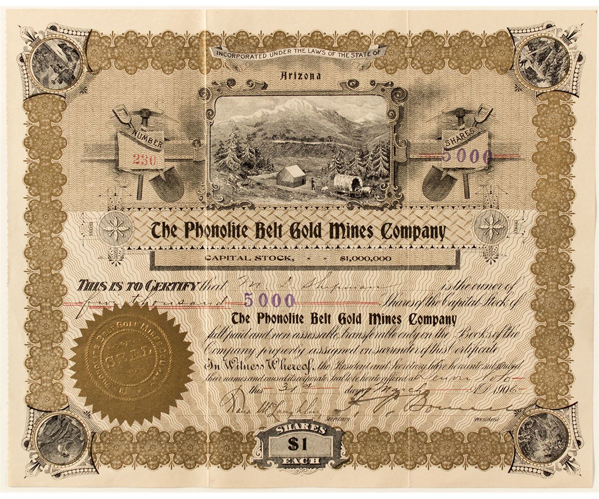 Rare certificate from "The Phonolite Belt Gold Mines Co." of Cripple Creek, (uncancelled). Certificate #230 grants M.D. Shipman 5000 shares of this tax-free Arizona-based company, signed by the President and Secretary. In excellent condition. Executed on the reverse side.