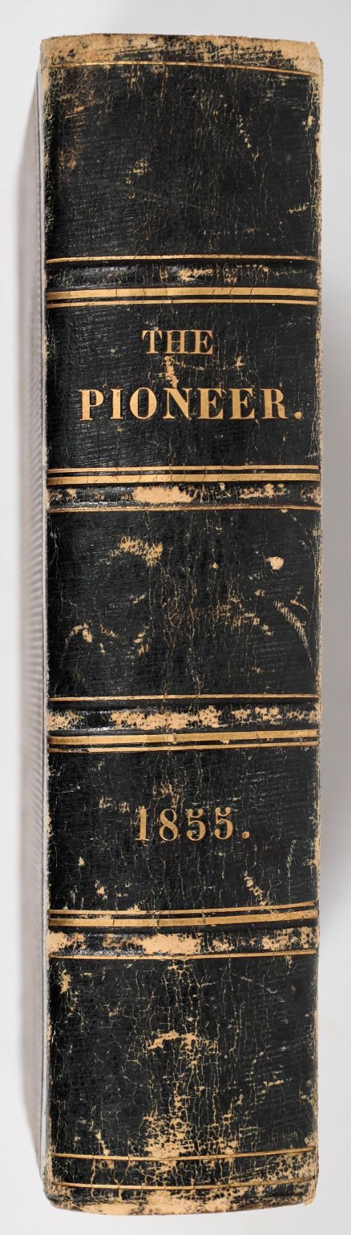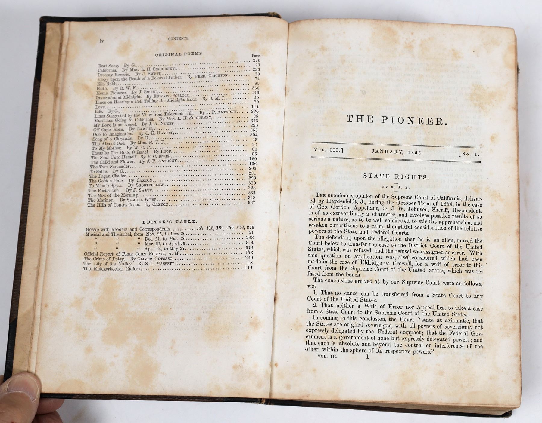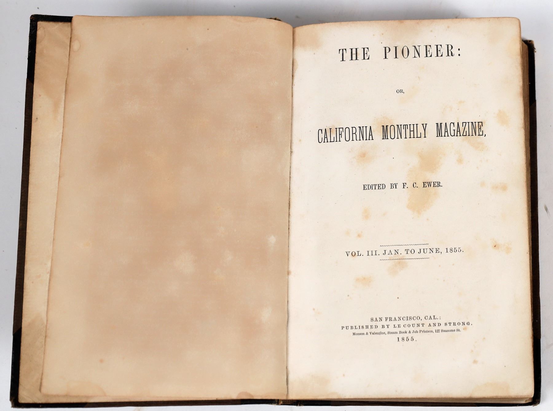 The Pioneer or California Monthly Magazine, edited by F.C. Ewer. Vol. III January to June 1855. Published by Lecount and Strong, 1855. Contains articles related to early California history, politics, mining, exploration, society, and leisure. An important historical work. 384 pages. Good condition. 6 x 9 inches. Contains the first publication of the famous Dame Shirley letters (23 of them) that she wrote to her sister in Massachusetts from her experiences in the Feather River’s Rich and Indian Bar diggings during 1851-2. The 1855 volume contains letters 12-23.