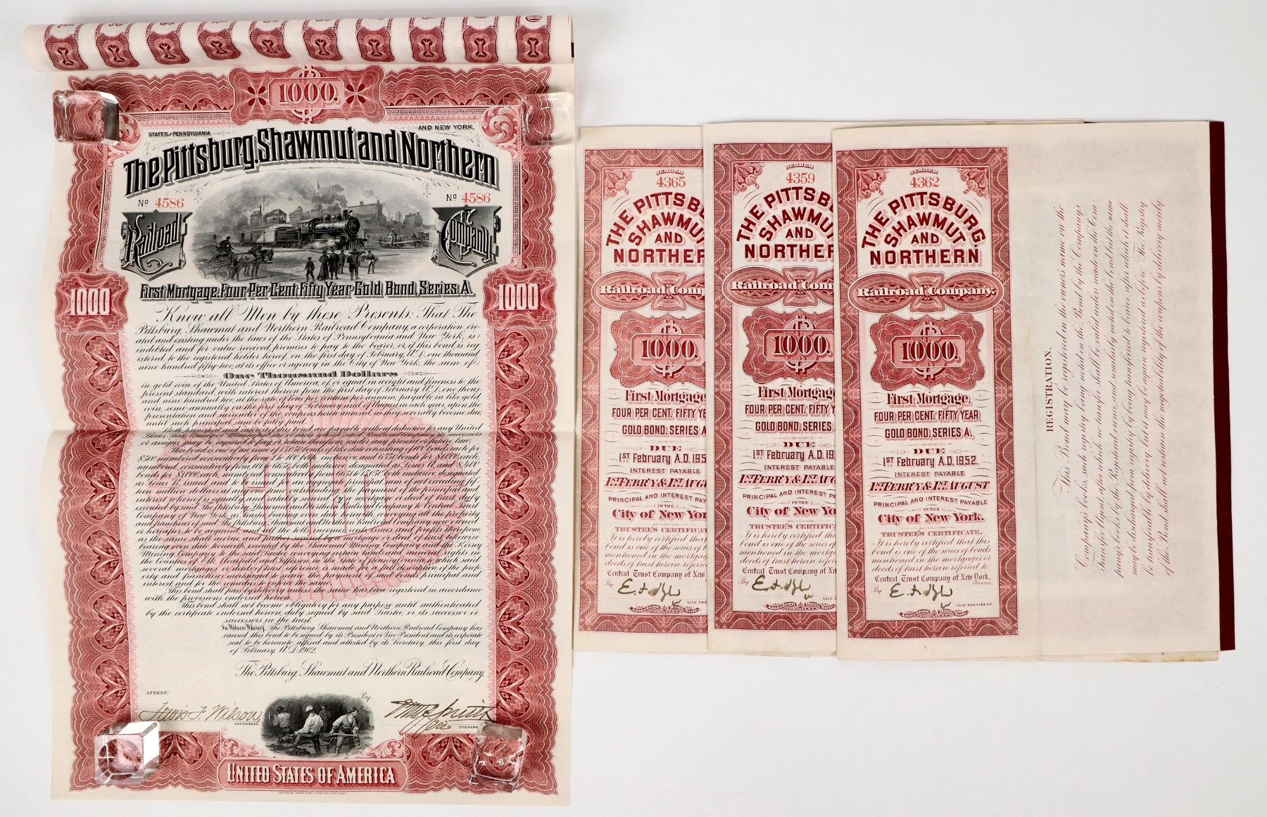 Lot of 4. I/U. Issued 1902.. EF cond. The Pittsburg Shawmut And Southern Railroad Co., $1000, 4% gold bearer bond with coupons. Fantastic vignette 4-4-0 train at depot with onlookers. American BNC printer.