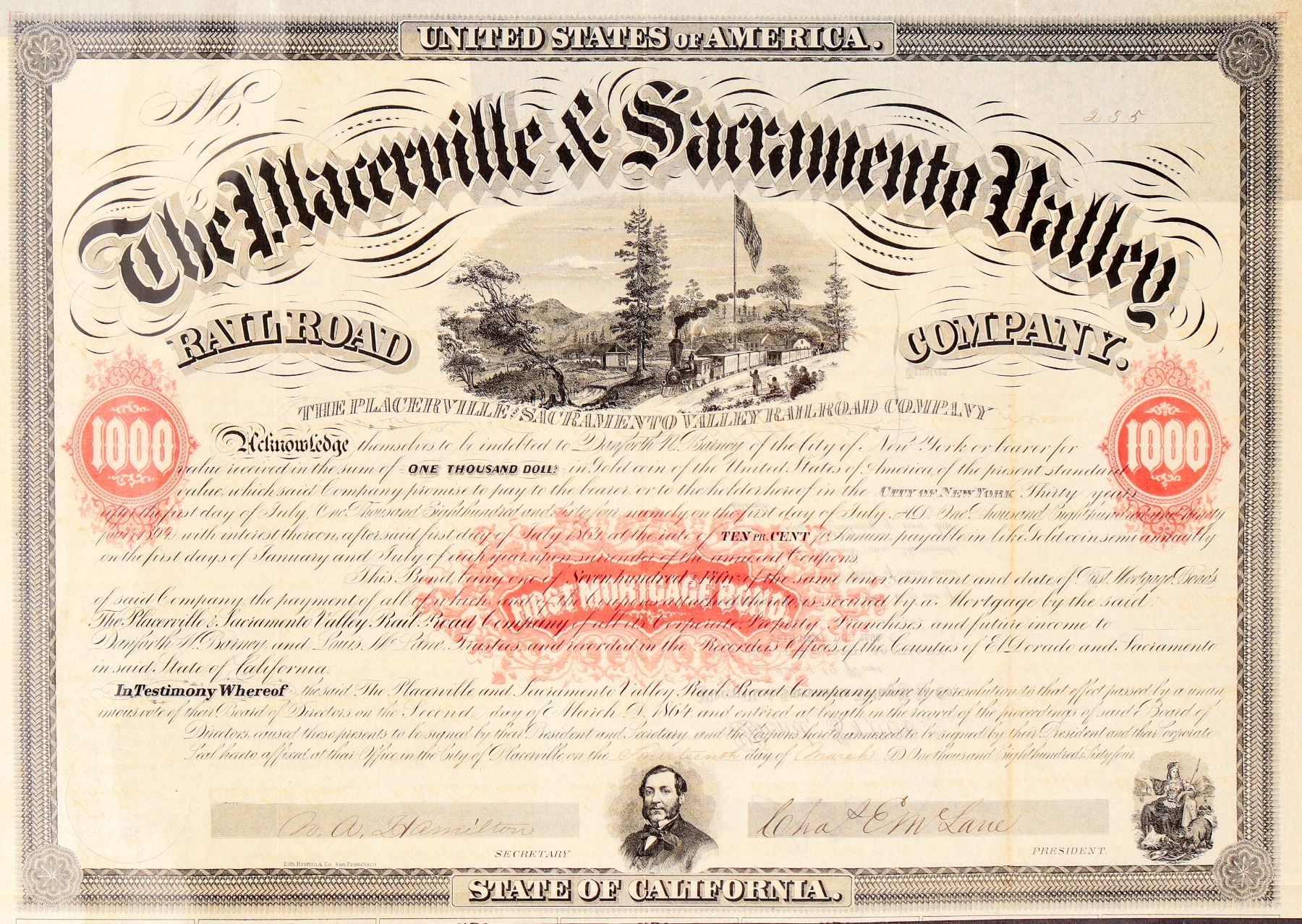 #255 of 750 authorized, I/U, $1000 10% 30 year First Mortgage gold bearer bond due 1894. Issued Mar 14, 1864 signed Chas. E. McLane President, BLACK, embossed seal w/indian and train center,. Vignettes : bottom center male looking r-l, bottom right state seal, top center 4-4-0 passenger trains passing country side w/ large American flag. "FIRST MORTGAGE BOND" red underprint box and "1000" red on either side. Coupons attached missing 1-4, Britton & Co. printer. No tears, holes or stains. Has fold crease (light) EF. Ken Prag Collection
