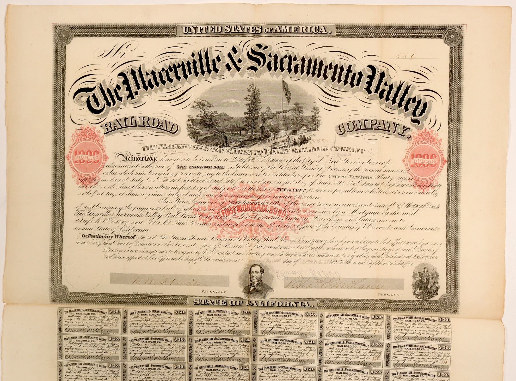 #551of 750, I/U, $1000 10% 30 yr. First Mortgage bearer bond issued March 14, 1884. Signed Chat E. McLane President. BLACK, embossed seal, vignettes: bottom-male figure looking r-l , bottom right state seal, top 4-4-0 leaving depot w/large American flag. red overprint right/left "1000) w/"DOLLARS" printed over. "FIRST MORTGAGE BOND" red underprint. Coupons #4-60 attached . Britton & Co. printer. EF cond. Ken Prag Collection