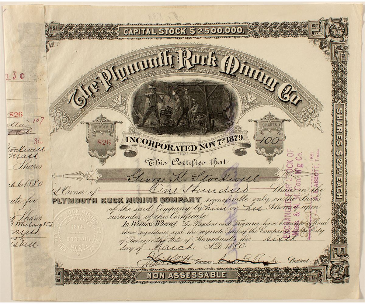 Cert. #826, issued at Boston, Mass. In 1880 to George K. Stockwell for 100 shares. Signed by Isaac B. Rich as president and J.E. Abbott as treasurer. Mines at Silver Flat, west of Silver City, Grant County, N.M. A silver- gold mining area discovered in 1871. Exchanged for stock of Mass. & N.M. Con. M'g Co. in 1881 (stamped on certificate), which took over the operation. Lines drawn thru the two signatures indicating cancellation. Stub attached at the left. Nice vignette of four miners working underground using picks and shovels. Fine.