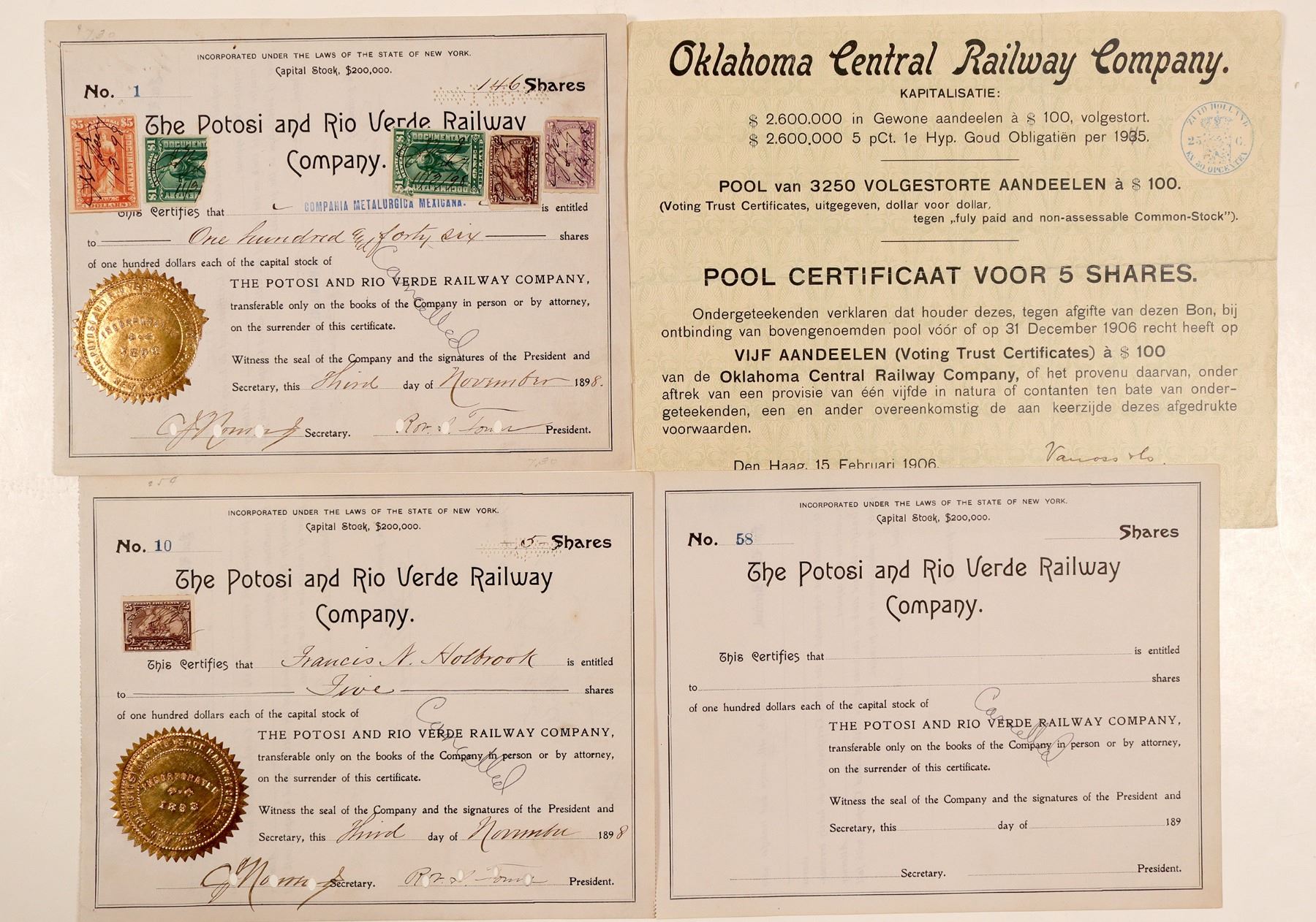 4 certificates. 1. Three Potosi and Rio Verde Railway Co. incorp 1898 New York . All Black border on white stock, gold embossed seal, no vignette, unknown printer. #58, U/C, $100 par. #1. I/C, 146 shares issued Nov 3, 1898. signed signature obscured. 5 documentary stamps. #10, I/C, 5 shares issued Nov. 3, 1898. Signed signature obscured. Three documentary stamps.