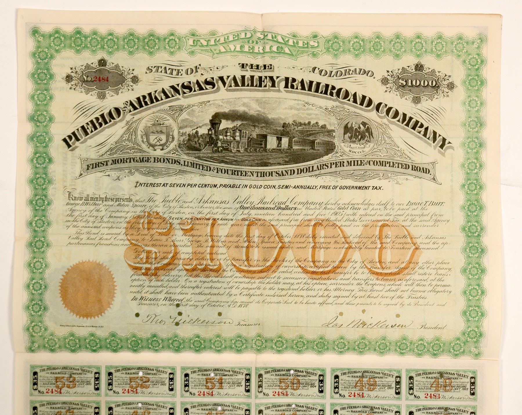 #2484, I/C, $1000 7% First Mortgage Gold Tax Free bearer bond due 1905. Issued Oct. 1, 1878. Signed Jos. Nickerson President. GREEN, embosses seal, vignettes: state seal, 4-4-0 passing men working , two eagles. "$1000" brown underprint. Coupons attached #2-53. Henry Seibert & Bro. printer. EF Ken Prag Collection