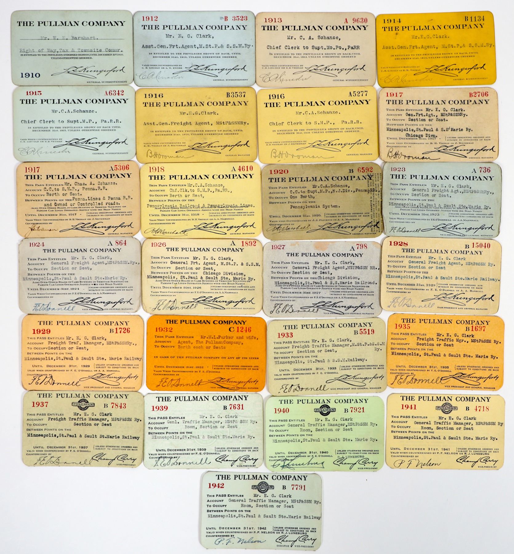 Group of 25 railroad passes from the Pullman Company. Passes date from the early 1900s; see photos for specific years and additional detail.